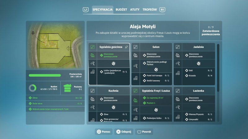 Twórcy byli świadomi problemu, co widać po praktycznie nieistniejących wymogach co do wyposażenia pomieszczeń. Najczęściej ogranicza się to do zadań typu: „dodaj łóżko w pokoju” lub „kuchnia musi zawierać jeden blat, zlew i kuchenkę”. Dla wielu pokojów, takich jak pralnia czy garaż, nie istnieją żadne wymogi co do umeblowania, a wystarczy pomalować ściany i dodać podłogę. Mnóstwo jest tutaj dziwnych decyzji, które nie współgrają z naszym lokalnym typem budownictwa. Lodówka w kuchni jest elementem dekoracji, a nie wymogiem, a toaleta zawsze musi być w osobnym pomieszczeniu oddzielonym od łazienki. Co prawda można podzielić jeden pokój na kilka pomieszczeń, ale mechanicznie wydaje się to strasznie przekombinowane i nienaturalne.