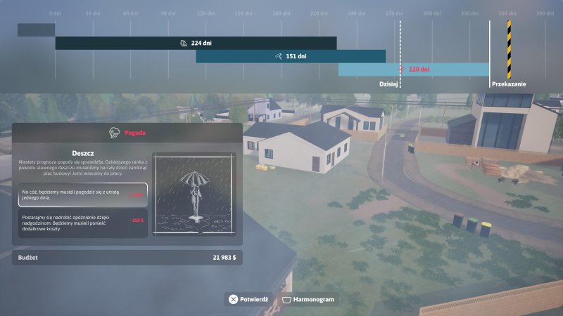 Kiedy już ukończymy naszą konstrukcję i przejdziemy przez wycenę budżetu przeznaczonego na prace strukturalne, wykończeniowe oraz zewnętrzne, pozostaje nam zorganizować przetarg i wybrać firmy, które zajmą się budowaniem. System ten jest prosty, ale całkiem interesujący. Widzimy przyspieszoną wizualizację stawiania domu, a co jakiś czas pojawiają się komunikaty o nietypowych wydarzeniach, do których doszło podczas budowy. Może być to na przykład kiepska pogoda albo wypadek pracownika, który nie zastosował się do przepisów BHP. Każde takie wydarzenie wymaga od nas podjęcia decyzji, czy dopłacamy do prac, czy może wydłużamy termin sfinalizowania projektu. Warto więc zostawić sobie poduszkę zarówno finansową, jak i czasową, na wypadek nieplanowanych sytuacji, ponieważ przekroczenie limitów będzie wiązać się z mniejszym zyskiem i niezadowoleniem klientów.