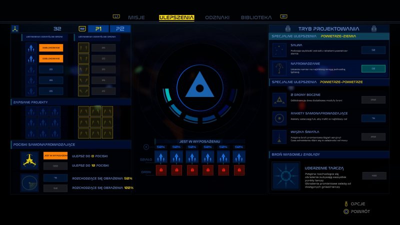 Skoro już wspomniałem, co mi nie pasuje, to pociągnijmy temat nieco dalej. Gra niestety nie zawsze nam podpowiada, co i jak możemy zrobić, np. w menu uzbrojenia mamy możliwość stworzenia własnych wzorów prowadzenia ognia. Są to schematy, jak mają się rozchodzić pociski broni podstawowej w trybie ostrzału. Gra niestety nie informuje, w jaki sposób można ten wzór ustawić, oraz jak go wykorzystywać podczas rozgrywki. Odkryłem to dopiero przypadkiem, bodajże w 6 misji podczas rozgrywki. W przypadku samego systemu ulepszeń również miałem problem ze zlokalizowaniem zdobytej waluty na ulepszenia i jej wartości.