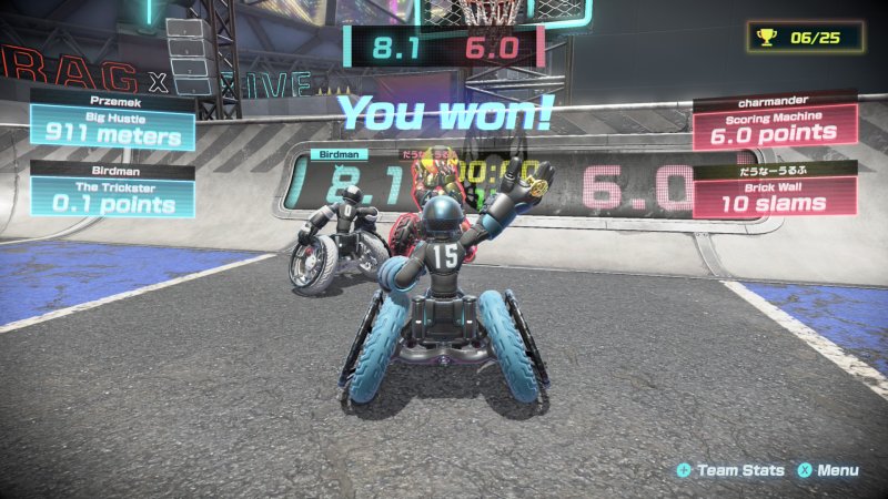 Niestety, ogromnym problemem Drag x Drive jest fakt, że zawartość w żaden sposób nie jest w stanie utrzymać graczy na dłużej. Już po kilku meczach zobaczymy wszystko, co tytuł ma do zaoferowania. Mamy co prawda trzy klasy postaci, które charakteryzują się inną szybkością, siłą i zwinnością, ale w rzeczywistości różnice pomiędzy nimi na tak niewielkiej planszy są często bez znaczenia i liczy się wyłącznie to, który gracz jako pierwszy sięgnie piłki.