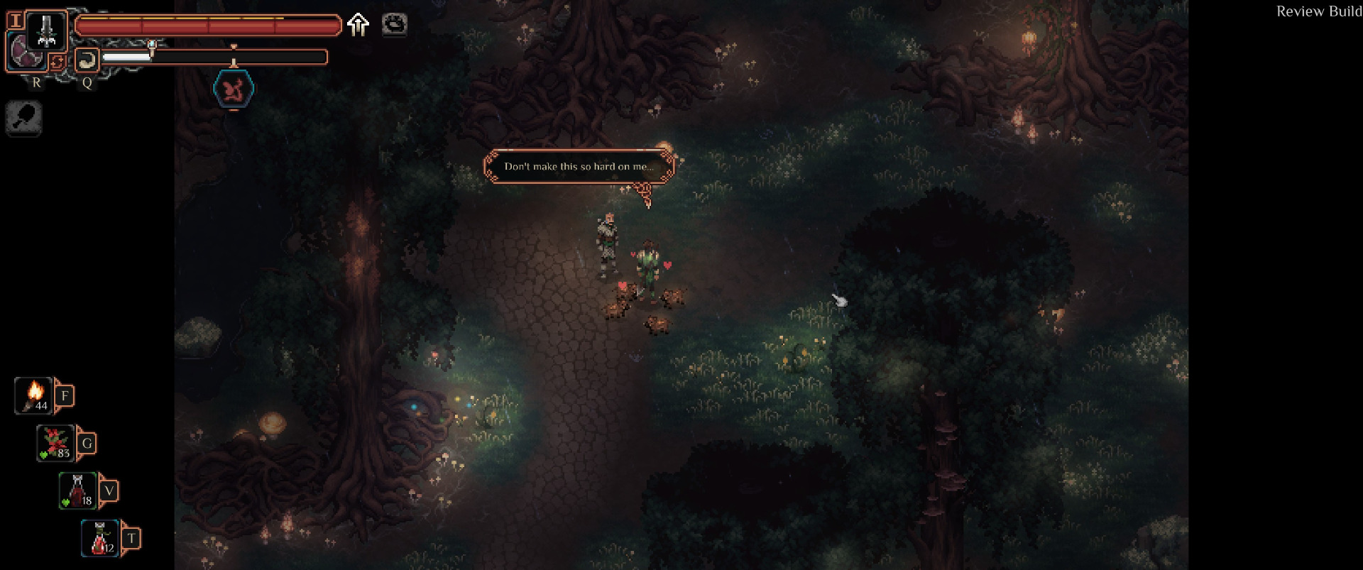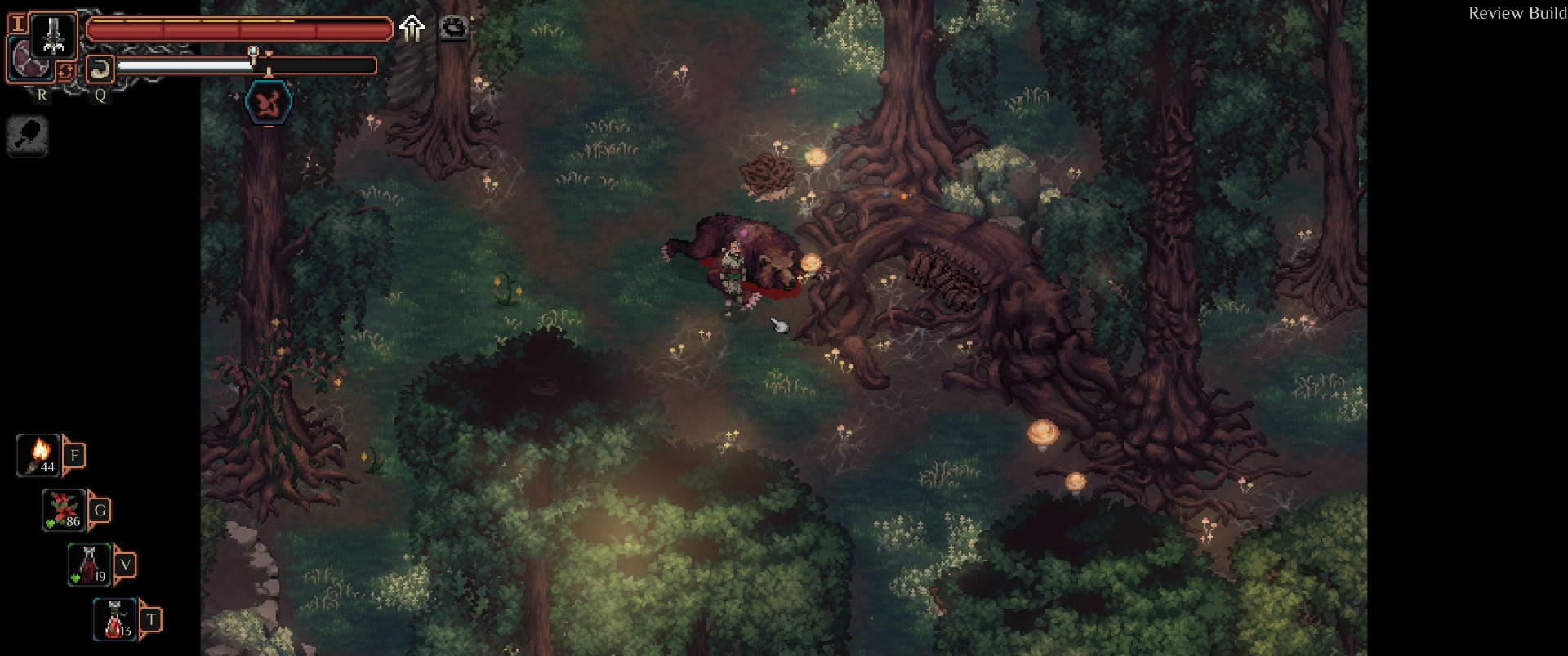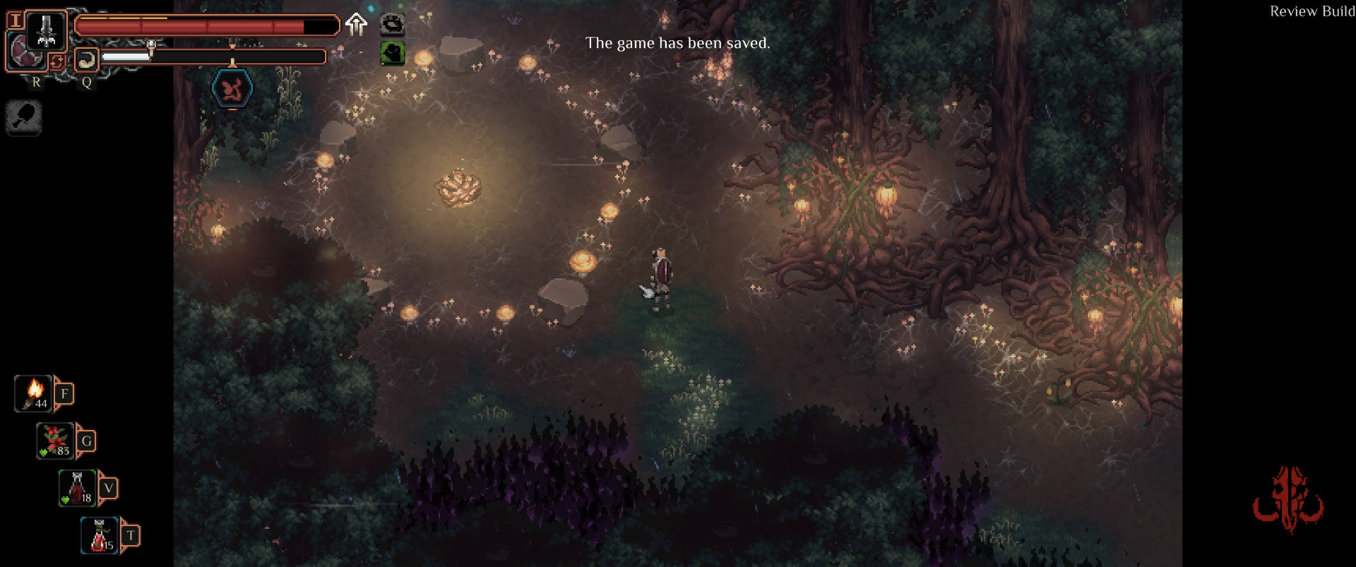 Zwiedzanie dwuwymiarowego świata Forsaken Kin to doświadczenie przepełnione mrokiem oraz czyhającymi na każdym kroku zagrożeniami. To również jeden z ładniejszych pixelartów z jakim miałem do czynienia. Lokacje są pełne detali i nieraz łapałem się na tym, że po prostu stoję w miejscu i wpatruję się w ekran, zamiast szukać sposobu na rozwiązanie kolejnego zadania. Pięknie prezentuje się oświetlenie. Pochodnie, ogniska czy świetliki potrafią zupełnie odmienić charakter wielu lokacji. Mamy tu również pełny system dnia i nocy. Za dnia malownicze lasy, nocą straszą legionami nieprzeniknionych cieni.