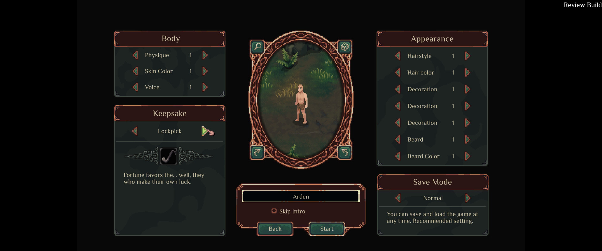 Początek zabawy przypomina nieco ekrany witające nas w soulsowych grach From Software. Dostajemy dosyć rozbudowany ekran kreacji postaci, na którym decydujemy się nie tylko na kolor skóry czy fryzurę, ale też wybieramy zaskakująco wiele detali naszej małej, pikselowej twarzy, która przez większość czasu pozostanie ledwie widoczna. Podejmujemy tu również decyzję odnośnie do przedmiotu, z jakim wkroczymy do świata gry oraz trybu zapisu. Możemy postawić na klasyczne sejwy w dowolnej liczbie, kiedy tylko zechcemy, lub na rozgrywkę na jednym slocie, jeżeli chcemy mocniej odczuć wagę podejmowanych przez nas decyzji.