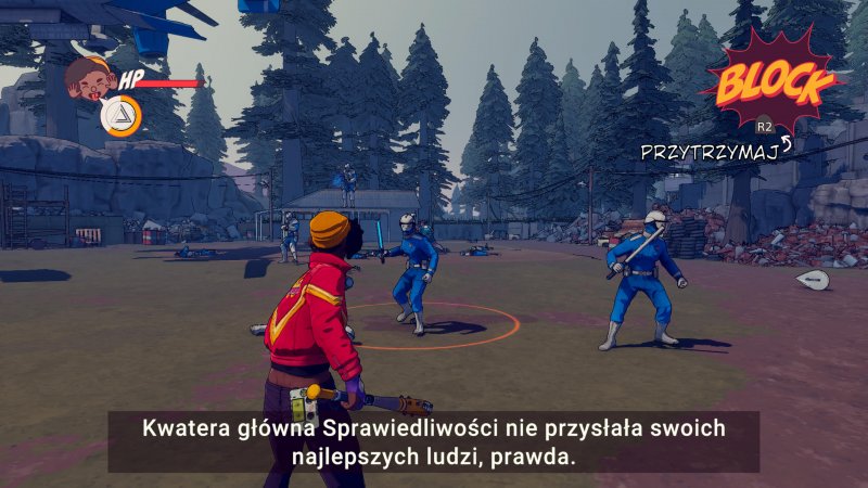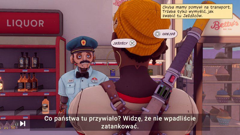 Już we wstępnie zaznaczałem, że Dustborn nie jest grą, którą łatwo zaszufladkować. Pomimo iż większość gry spędzamy na przemierzaniu świata i budowaniu relacji z innymi bohaterami, pojawiają się liczne momenty, w których musimy sięgnąć po nieco brutalniejsze środki. Podróżując przez szerokie drogi dawnych Stanów Zjednoczonych, napotkamy na swojej drodze liczne grupy gangów motocyklowych, agresywnych robotów czy patrolów jednostki Justice. Kiedy negocjacje zawodzą, Pax nie waha się sięgnąć po kij baseballowy, aby poturbować swoich przeciwników.