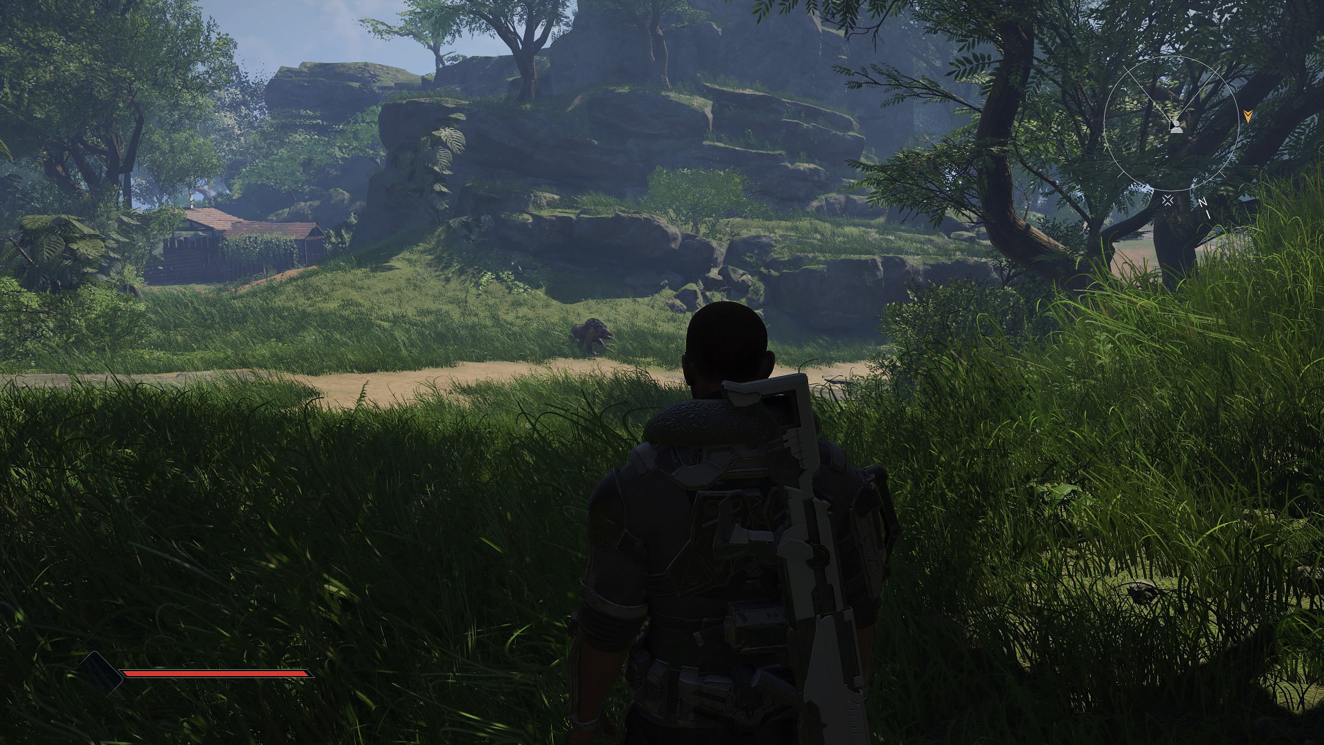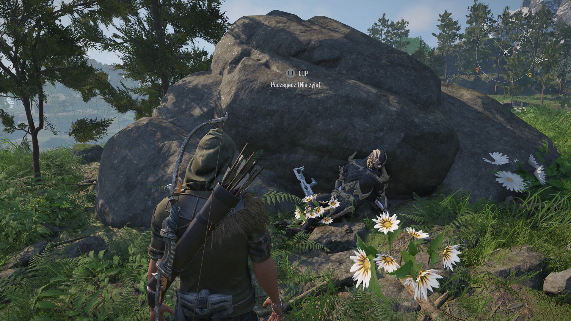Miłym dodatkiem jest również implementacja haptycznych wibracji, które to różnią się siłą i stopniem w zależności od posiadania łuku bądź karabinu. Opór spustu tego ostatniego czujemy dokładnie, przyciskając przycisk z niewielką siłą, a łuk napniemy w pełni, stopniowo zwiększając nacisk. Plecak rakietowy umieszczony pod przyciskiem L2 również korzysta z tej technologii, zapewniając dwa osobne stopnie mocy w postaci podtrzymania aktualnej wysokości i samego latania. Dla osób niezaznajomionych z oferowanymi przez DualSense ficzerami funkcja ta może wydawać się błaha, ale zapewniam, że znacząco zmienia ona doświadczenia z rozgrywki nawet przy najbardziej banalnych czynnościach.