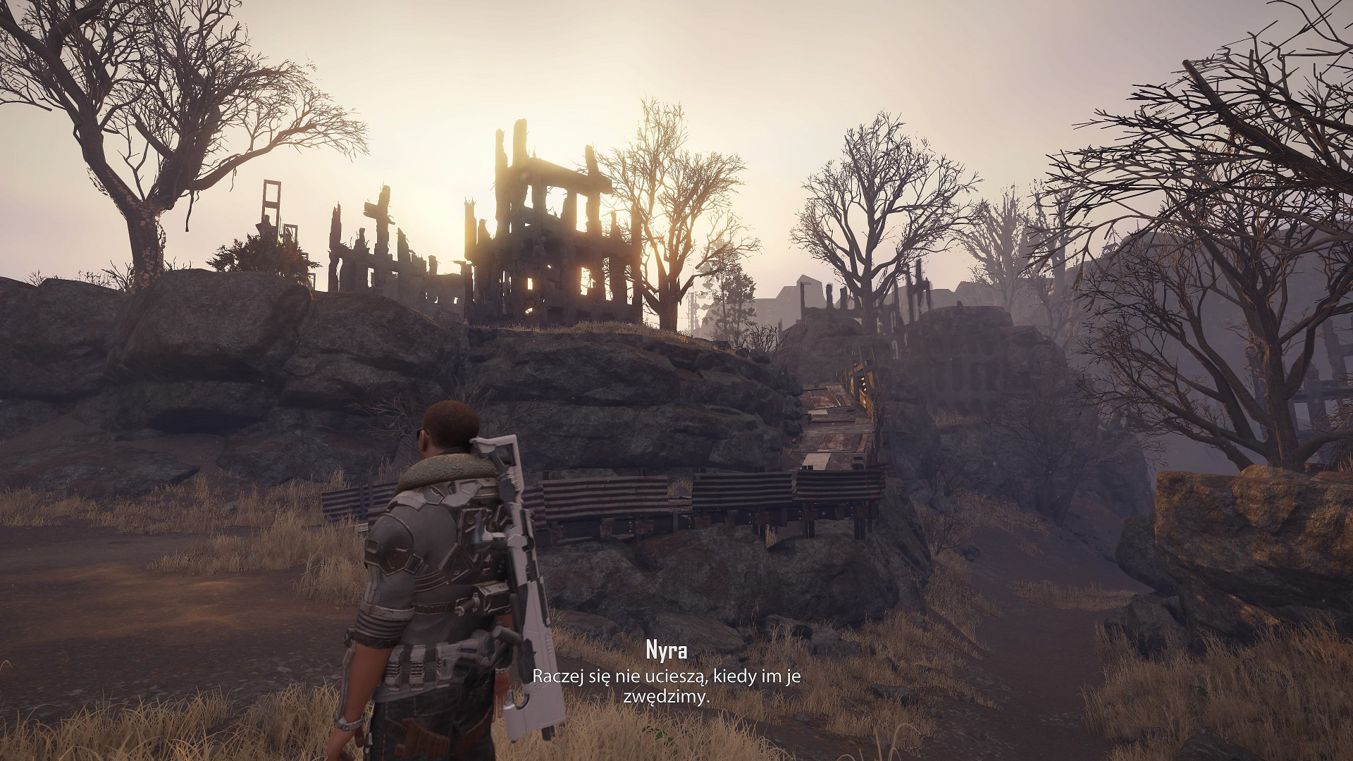Jak się zapewne domyślacie wspomniany kontrast nie jest widoczny jedynie w samych zadaniach, a przede wszystkim w grafice. Gry tego dewelopera były w przeszłości wielokrotnie krytykowane za zacofaną oprawę wizualną. Tym większym zdziwieniem okazał się dla mnie fakt, że Elex II prezentuje się naprawdę dobrze, przynajmniej w większości przypadków. Krajobrazy, woda i budynki to często światowa półka, która po prostu zachwyca na tyle, że aż odruchowo sprawdza się obecność trybu fotograficznego, którego niestety w produkcji nie uświadczymy. Kolejno trawa, drzewa czy efekty pogodowe i oświetlenie prezentują się znakomicie, a świat ocieka wprost klimatem. Z drugiej strony twarze postaci sprawiają często okrutnie plastikowe wrażenie, co wygląda to szczególnie komicznie w zestawieniu z faktem, że stykające się z samymi twarzami stroje wykonano bardzo starannie.