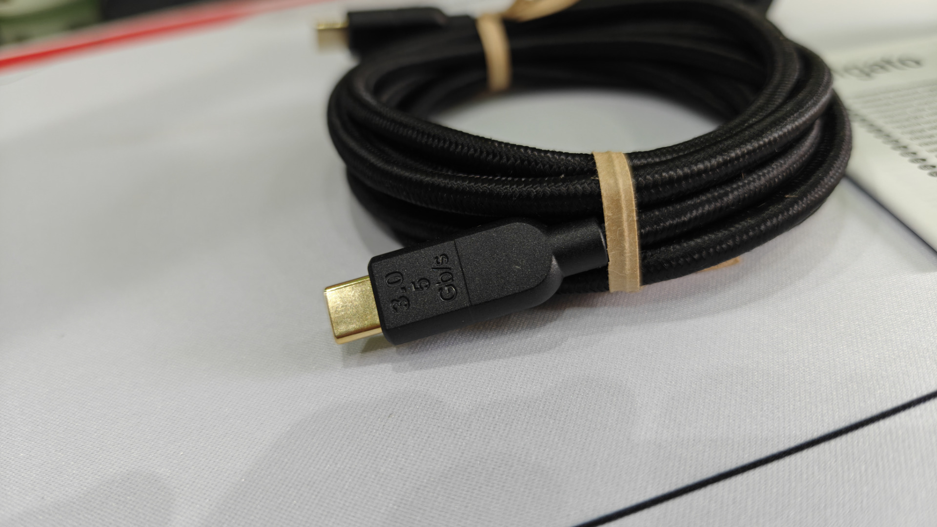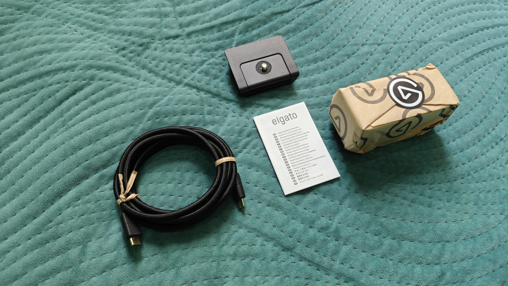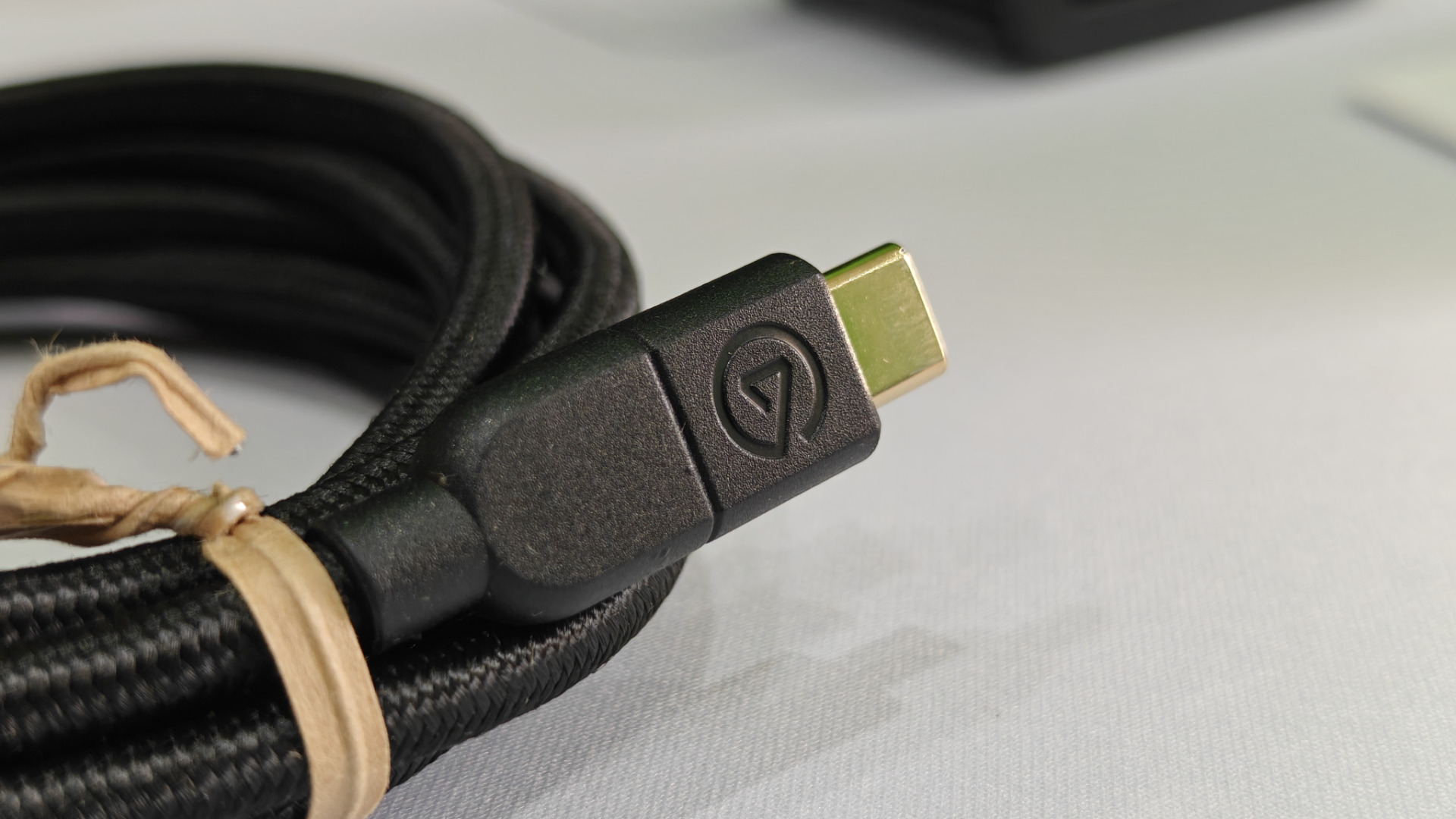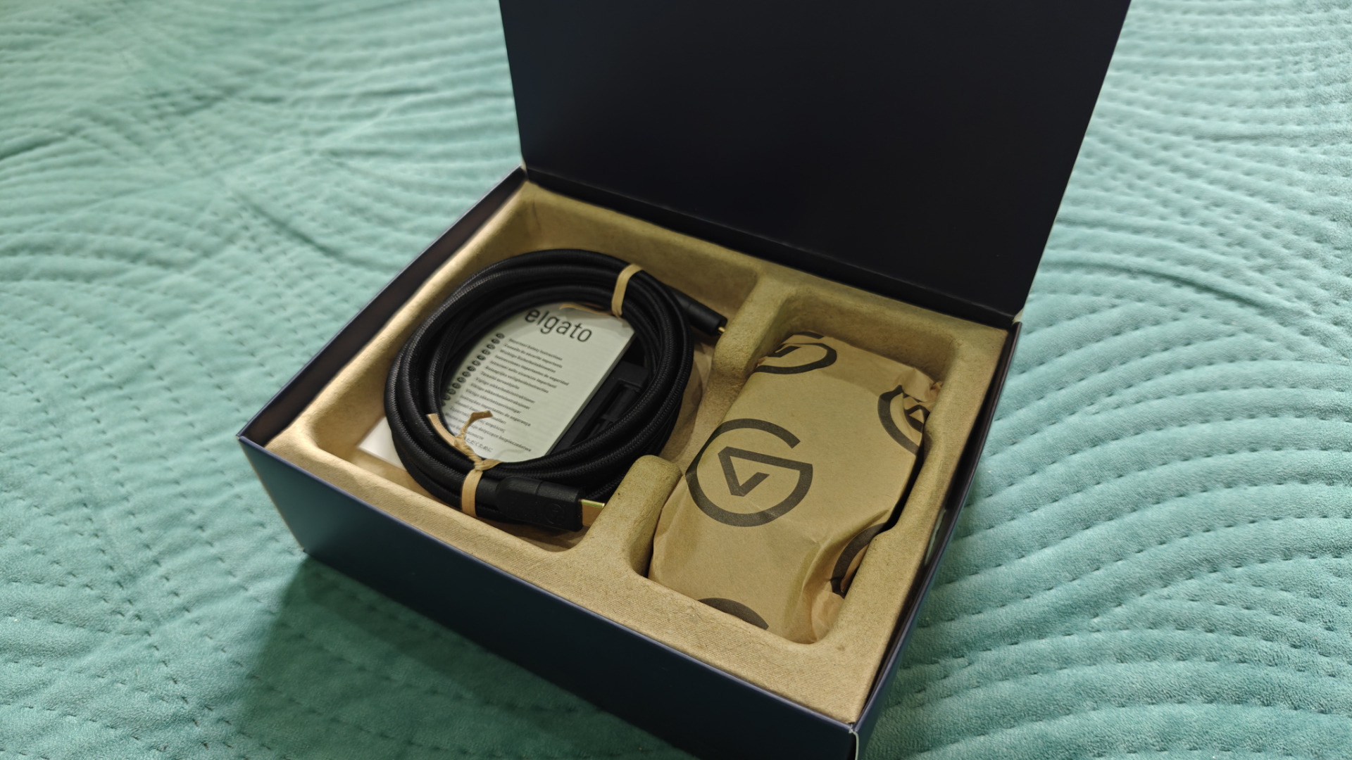Dołączony do zestawu kabel USB typu C również sprawia solidne wrażenie. Jest w materiałowym oplocie, długi na dwa metry, a jego grubość wskazuje na to, że nie jest to byle co. Zresztą widać, że został wyprodukowany na specjalne życzenie Elgato — posiada wytłoczone logo tej firmy, a na drugim końcu potwierdzenie jego prędkości — 5 Gb/s.
