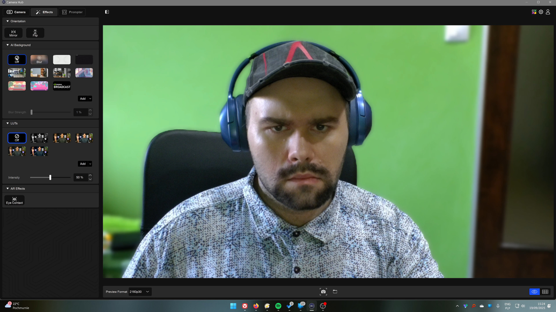 CameraHub oprócz zmiany ustawień, korekcji kolorów, czy opcji odszumiania obrazu pozwala także na skorzystanie z funkcji AI oferowanych przez oprogramowanie Nvidia, jeśli mamy kartę graficzną GeForce. Za jej pomocą możemy usuwać tło, włączyć automatycznie śledzenie twarzy, czy nawet imitować fakt patrzenia w obiektyw.