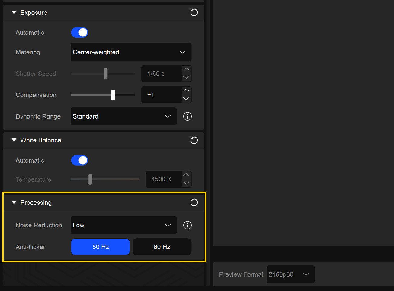 Jeśli jednak godzimy się na pewne kompromisy, to możemy spróbować nagrywania w 4K, ale w 30 klatkach na sekundę. W teorii migawka może wtedy otwierać się radziej, co powinno zredukować szumy. Możemy też wtedy skorzystać z trybu przesyłania obrazu w formie mniej skompresowanej z użyciem formatu NV12 zamiast MJPEG.