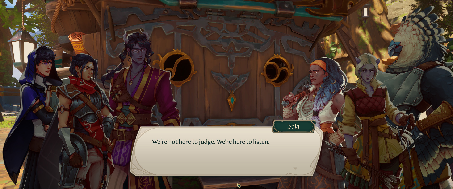 Mocno stylizowana oprawa szybko się nie zestarzeje. Przynajmniej jeśli mowa o wszystkim innym oprócz modeli postaci, które są tak przeciętne, że miejscami wręcz słabe. Postawienie na ręcznie rysowanych bohaterów, jakich obserwujemy podczas rozmów, zamiast ich modeli 3D, to bardzo rozsądne posunięcie ze strony twórców. Nie mam ochoty patrzeć na pustkę w oczach naszych obozowych kompanów dłużej niż to absolutnie niezbędne.