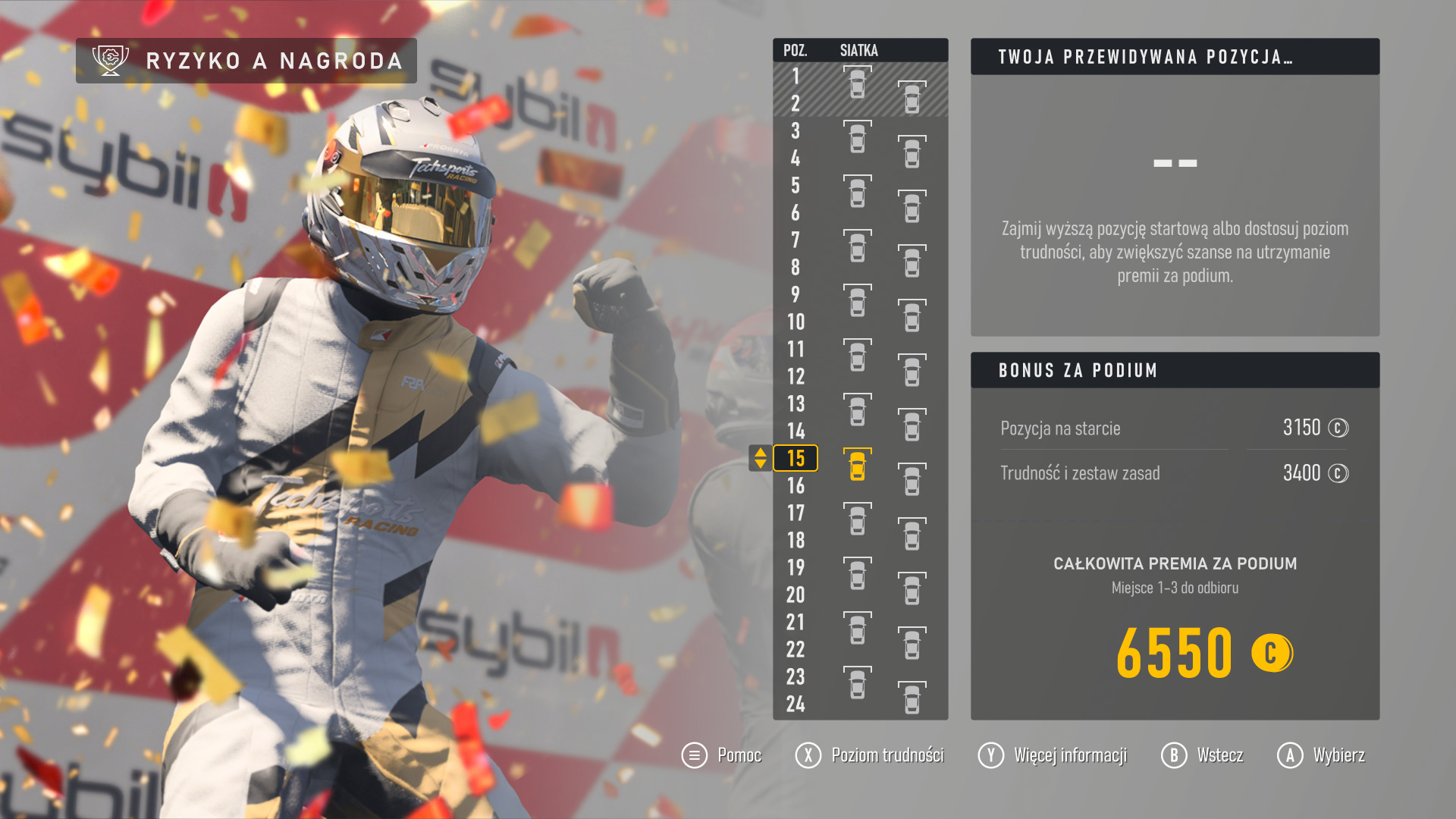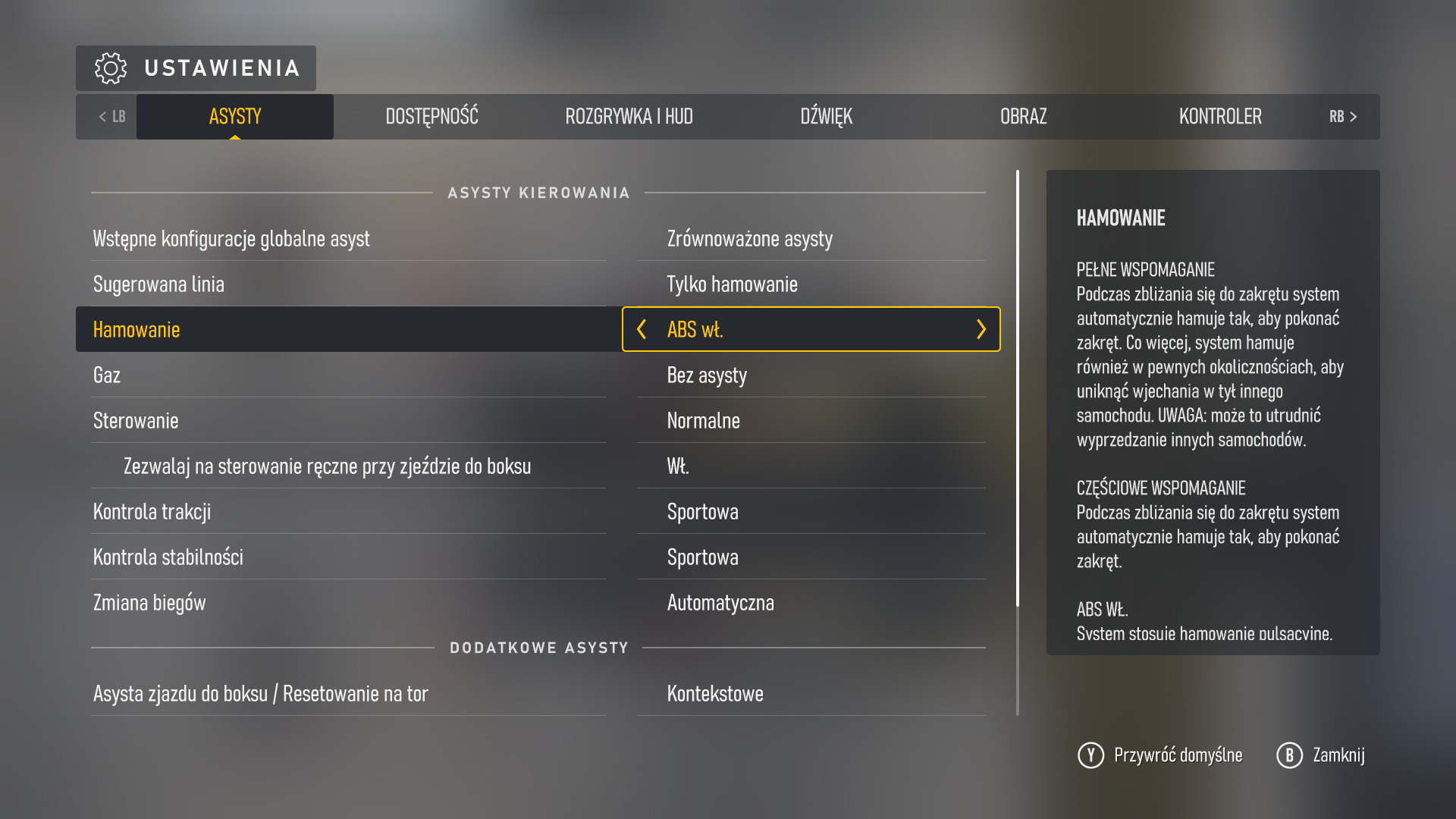 Turn 10 zadbało, by każdy gracz mógł się dobrze bawić w ich nowej grze. Menu asyst jest ogromne i możemy w nim ustawić wszelkie "wspomagacze", które pomogą nam lepiej radzić sobie podczas wyścigu. Linia wyznaczająca trasę, spowolnienie przed ostrym zakrętem, ABS i kontrola trakcji, czy choćby wybór manualnej lub automatycznej skrzyni biegów. To tylko kilka ustawień, które możemy dobrowolnie wybrać i mogą poprawić nasz komfort jazdy. Włączanie wspomagaczy wiążę się jednak z tym, że będziemy otrzymywać mniejszą ilość punktów za ukończone wyścigi, które potrzebne nam są do kupowania innych samochodów. Przed rozpoczęciem wyścigu, ustalamy również, z której pozycji będziemy startować, co wiąże się z dodatkowym bonusem w postaci kredytów.