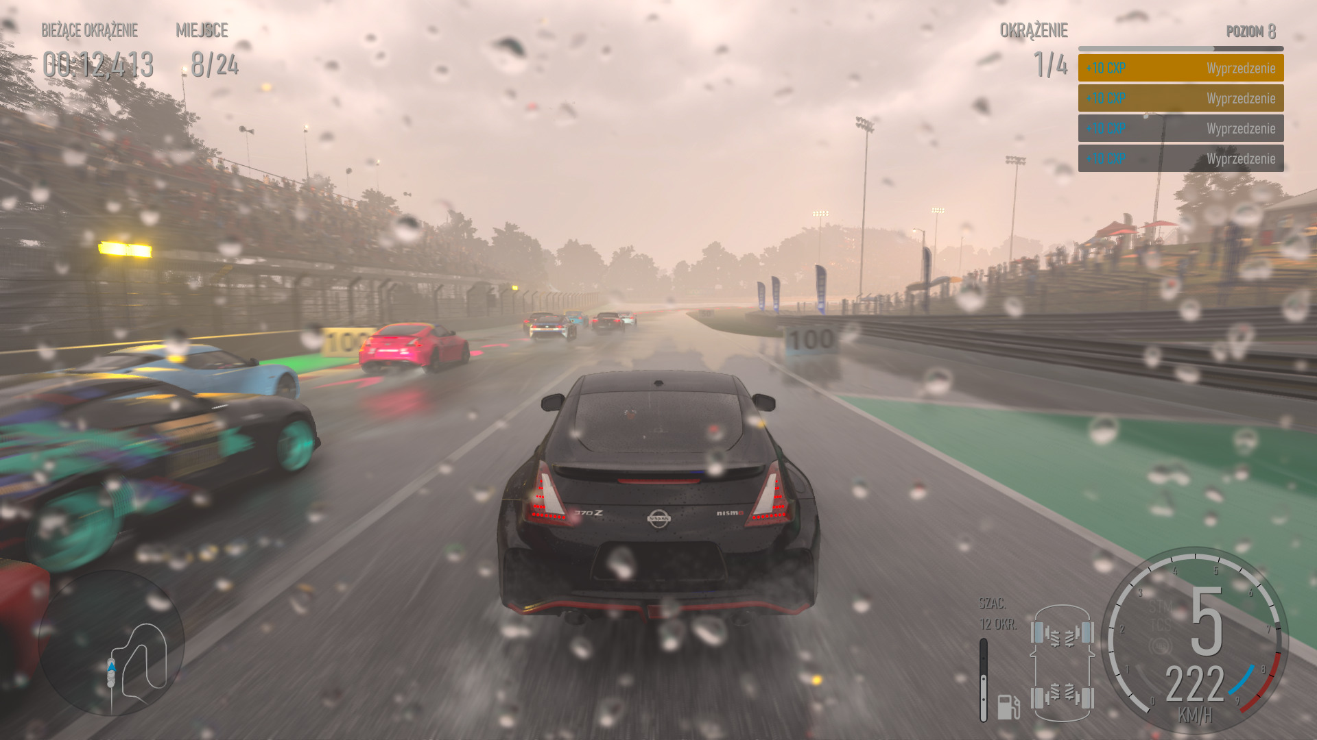 Element, który nieco mnie rozczarował to tory wyścigowe. Sam fakt, że na premierę jest ich znacznie mniej niż w poprzedniej części (20 do 32 z Forza Motorsport 7), to uważam, że nie włożono w nie tyle pracy ile w modele pojazdów. Nie twierdzę jednak, że są one brzydkie lub niedopracowane, ale zabrakło w nich efektu "Wow", takiego jak na torze w Dubaiu w Forza Motorsport 7. Sprawdzając stronę graficzną torów, byłem pod niemałym wrażeniem, jak niektóre z nich, prezentują się podczas wschodu słońca, gdy nawierzchnia jest jeszcze lekko mokra, ale w idealnych warunkach pogodowych nie robiły na mnie praktycznie żadnego wrażenia. Warunki atmosferyczne również są bardzo dobrze dopracowane. Zmienna pogoda w czasie trwania wyścigu potrafi zupełnie odmienić wygląd toru, a krople deszczu na przedniej szybie, zachowują się zgodnie z prawami fizyki. Nowa część cyklu poprawiła również roślinność oraz kibiców na trybunach. Flora wokół toru jest teraz bardziej bujna i realistyczna, a drzewa oraz pola w oddali są teraz wysokiej jakości i nie przypominają już zielonej paćki. Nie spodziewajcie się rewolucji w tym względzie, jest to jednak krok w dobrą stronę, a moce przerobowe zespołu raczej były skierowane w innym kierunku.