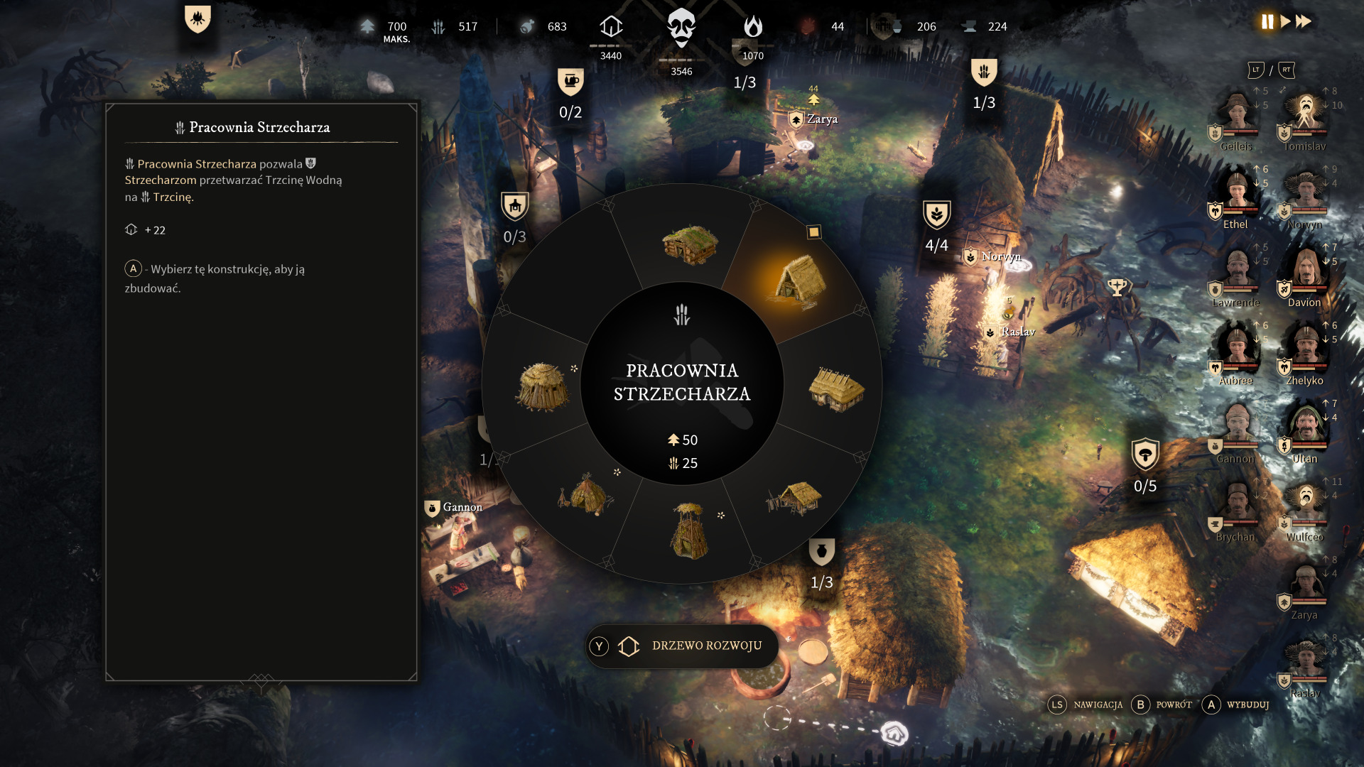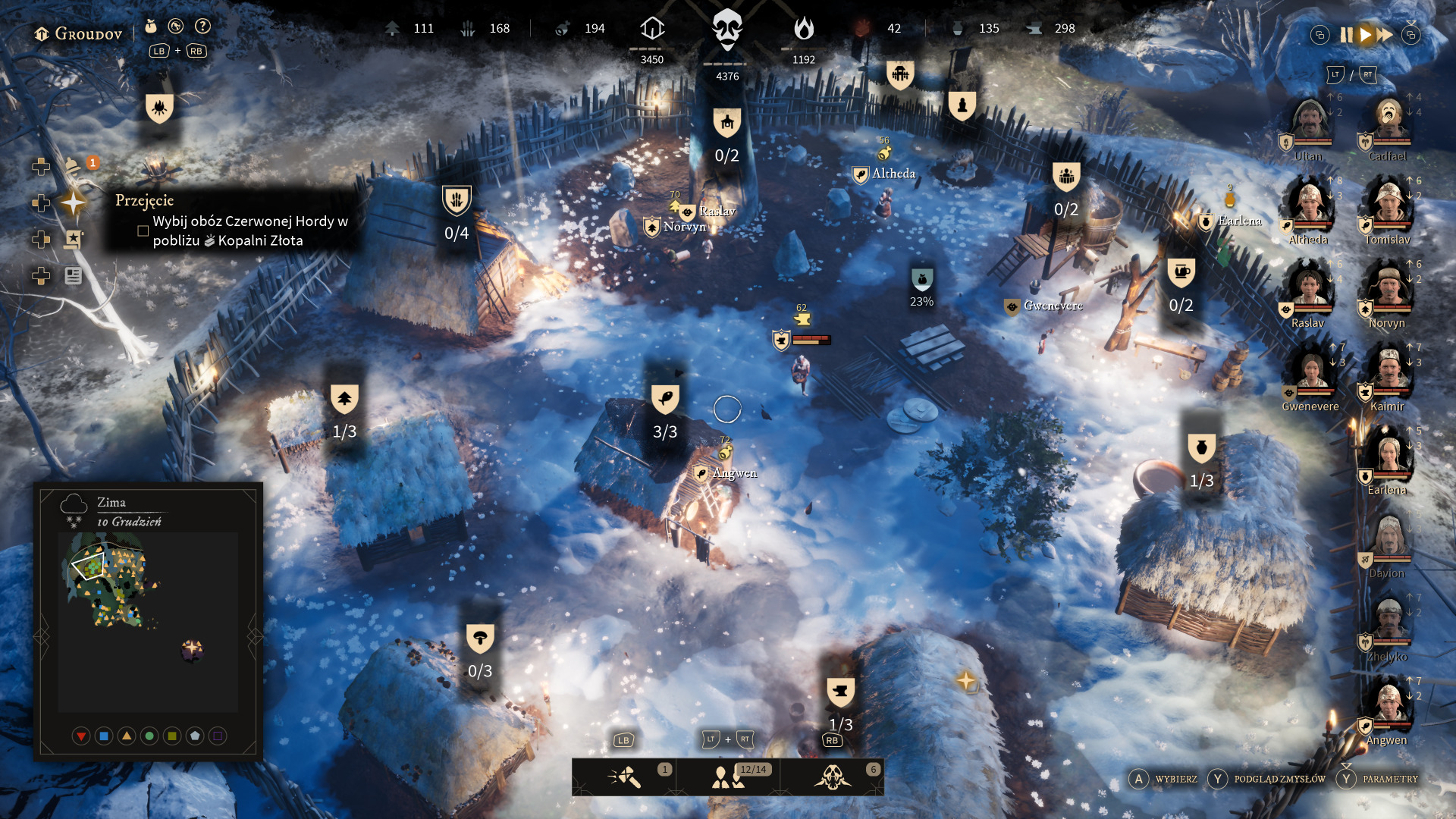 Na początku tekstu, nazwałem tę grę "citybuilderem", choć określenie to jest mocnym nadużyciem. Nasz gród może pomieścić kilka lub kilkanaście budynków, które dodatkowo możemy ulepszać, więc warto budować je w rozsądnych miejscach. "Gord" przypomina mi bardziej połączenie "Frostpunka" oraz "The Settlers" czy choćby starych "Polan". Trudno się oprzeć wrażeniu, że dużą inspiracją dla twórców był "Frostpunk", a zarządzanie poddanymi to właśnie mieszanka znana z RTS-ów czy z serii "The Settlers". Każdy osadnik to jednostka, którą możemy dowolnie zarządzać, ale warto mieć na uwadze predyspozycje naszych mieszkańców. Gra nie powala rozmachem i pod komendą mamy jedynie kilkanaście postaci (do tej pory nie udało mi się zdobyć więcej niż szesnastu osadników), gdzie każdy z nich posiada własne imię oraz upodobania. Jeden będzie czuł się lepiej w roli drwala, a drugi w roli wojaka. Każda cecha osobowości znacząco wpływa na naszą rozgrywkę, więc warto mieć to na uwadze. Osadników możemy zdobywać eksplorując mapę lub gdy pojawia nam się dziecko w osadzie. Przy tej drugiej opcji musimy zadbać o wychowanie naszego młodziana, ponieważ możemy go przypisać do POMOCY (dzieci nie mogą pracować) innemu osadnikowi i w ten sposób będą zdobywać doświadczenie i bonusy w wykonywanej czynności, a gdy staną się dorosłe, to będziemy cieszyć się dobrze wykwalifikowanym pracownikiem.