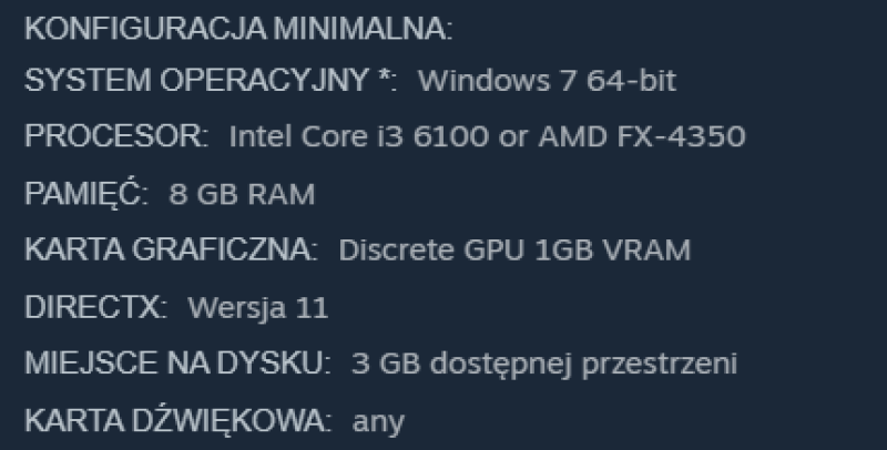 Jak widać, powyższa konfiguracja znacząco wykracza poza minimalną, która została udostępniona na Steamie. Rzecz jasna nie nakazuję Wam w tym momencie odpalać nowej karty i sprawdzać, jaka ona jest. Poniżej umieściłem zrzut ekranu, na którym wyraźnie widać to, co jest również dostępne na stronie dedykowanej tej grze w sklepie Gabena.