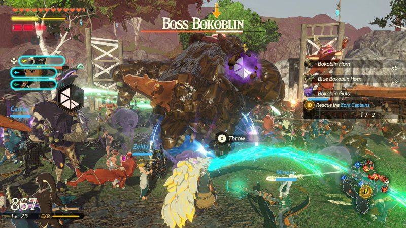 W arsenale znajdziemy także urządzenia Zonai zadające obrażenia na bazie żywiołów i mogące np. podpalić, zamrozić czy porazić wroga. Z czasem odblokujemy możliwość ładowania ataków specjalnych i ciosów skoordynowanych z inną postacią. Wisienką na torcie jest natomiast zbicie paska energii określanego jako „gauge” i osłabienie przeciwnika, co pozwala zadać wyjątkowo wysokie obrażenia.