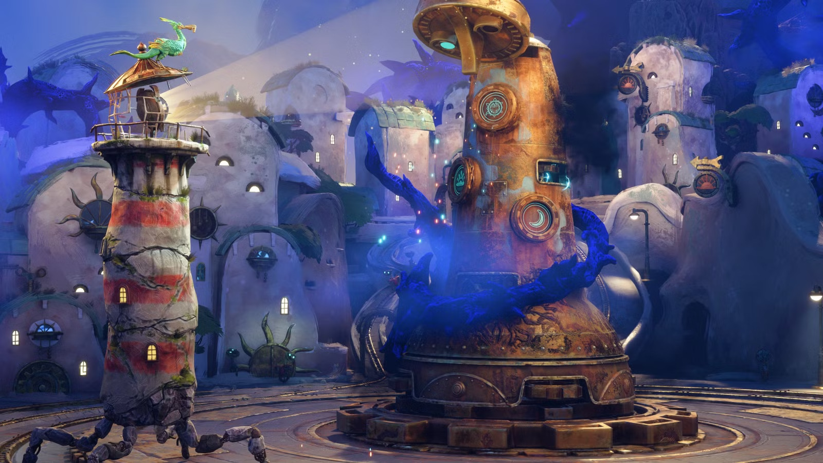 Wizualnie Keeper to absolutne dzieło sztuki. Świat gry to surrealistyczne, oniryczne malowidło. Zaczynamy na ponurym, skalistym wybrzeżu, ale szybko wkraczamy do fosforyzujących jaskiń, lasów, w których drzewa rosną korzeniami do góry, czy zrujnowanych, lewitujących miast z innej epoki. Paleta barw jest odważna, a design lokacji nieustannie zaskakuje. To jedna z tych gier, w których co chwilę zatrzymujemy się tylko po to, by podziwiać kadr.