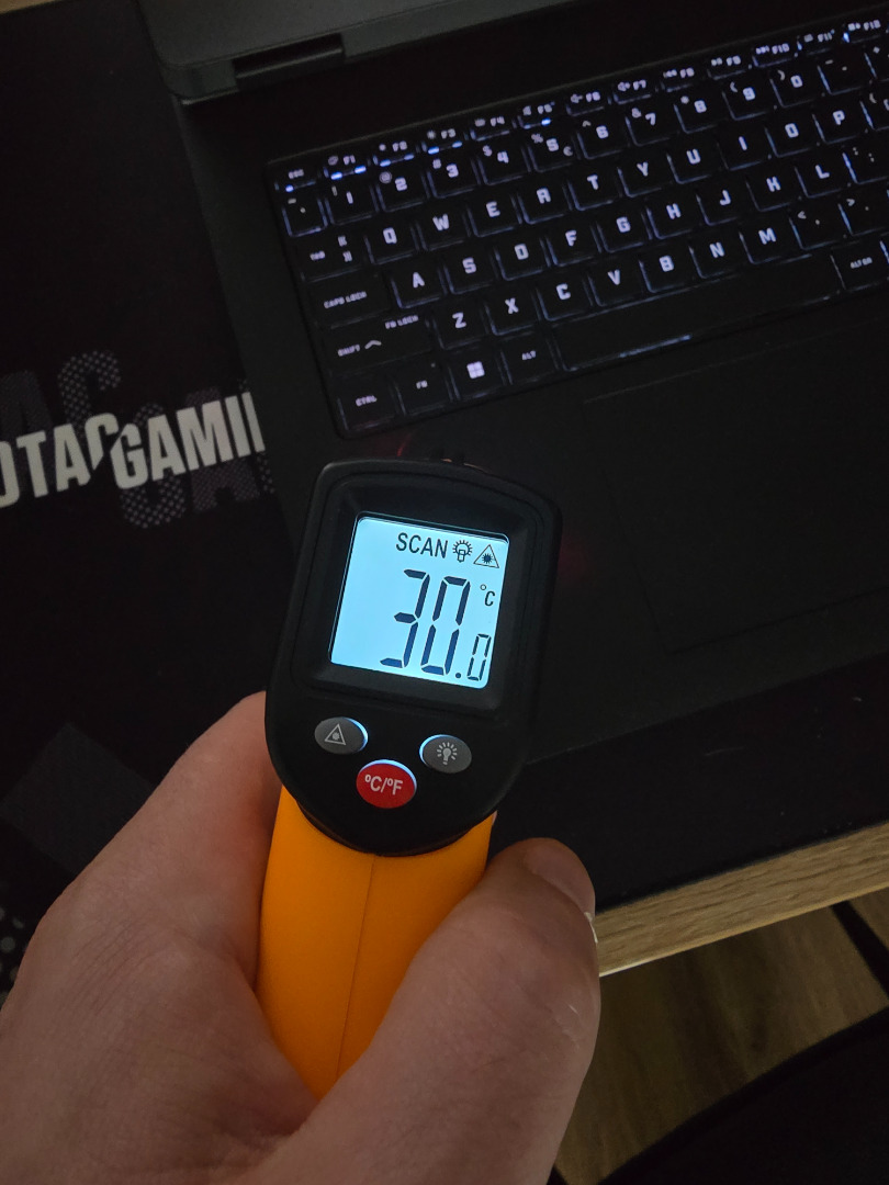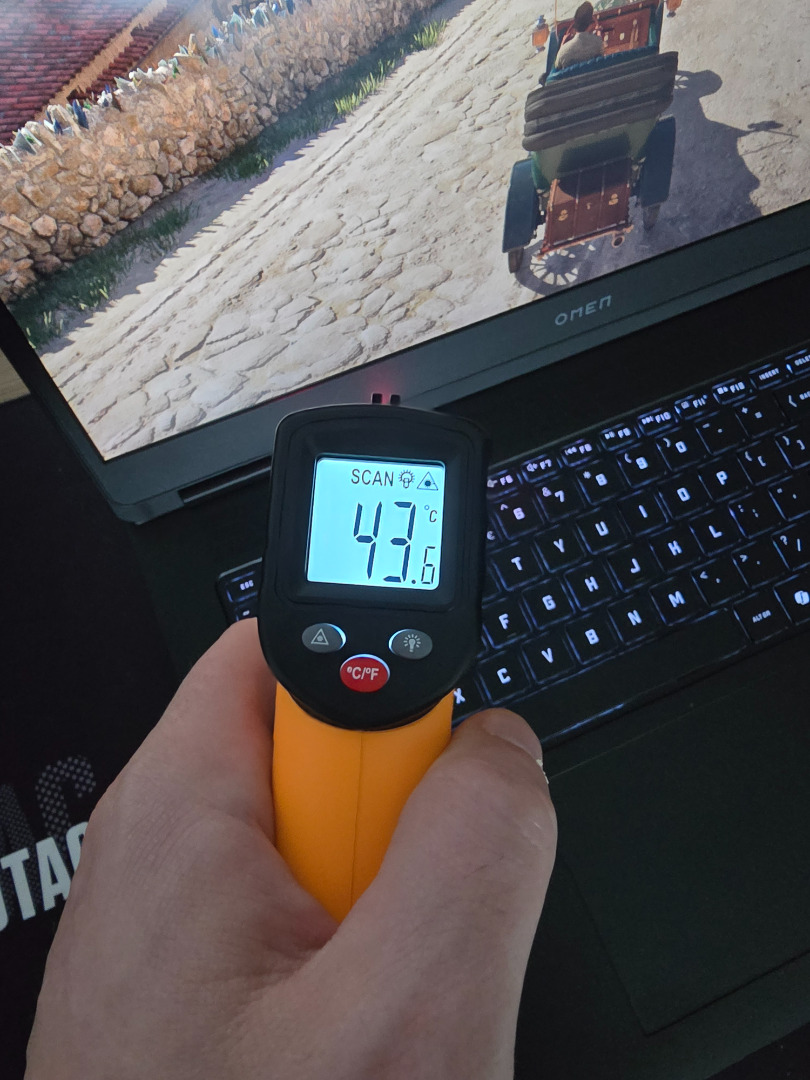 Obudowa nie grzała się mocno i korzystając z klawiatury, czy nawet opierając dłonie na obudowie laptopa, nie czułem rozgrzanych elementów, które wywoływałyby dyskomfort podczas gry. Zmierzyłem nawet temperaturę i pod maksymalnym obciążeniem, obudowa w miejscu, gdzie trzymam dłonie, osiągała maksymalnie 30C, gdzie przy ujściu wentylatorów balansowała w okolicach 45C.