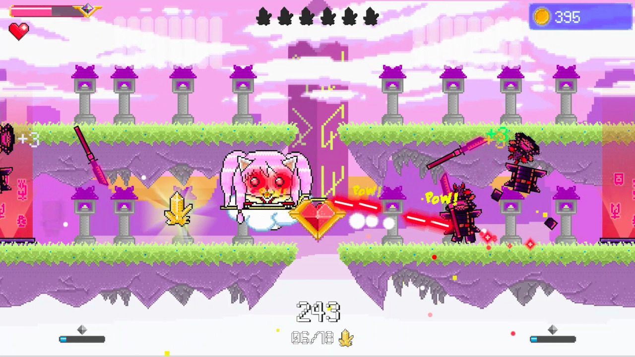 Trzon zasad każdego etapu jest równie prosty - na ekranie pojawiają się dwa punkty spawnu przeciwników (zawsze skrajnie z lewej i z prawej, ale czasem na różnych z dwóch "poziomów" etapu). Jeśli przeciwnik dojdzie do środka planszy - game over. W późniejszych etapach pojawiają się też przeciwnicy, którzy próbują naszego kotka załatwić specjalną bronią i zabijają go jednym ciosem, czy też pojawia się tryb nagłej śmierci i dotknięcie kogokolwiek to dla nas śmierć. Nie ma lekko. Naszym celem, poza strzelaniem laserem do przeciwników jest zbierać kryształy które są nagrodą za pokonanie każdej kolejnej fali przeciwników (pierwszy świat to 6, potem 12 a potem 16 kryształów), oraz - żeby znów nie było za łatwo - zebrać przynajmniej 50% monet które pojawią się na planszy (im dalej, tym bardziej "nie po drodze" się pojawiają i szybciej znikają). Mamy więc sporo rzeczy do zrobienia, mózg szaleje i naprawdę nie jest łatwo.