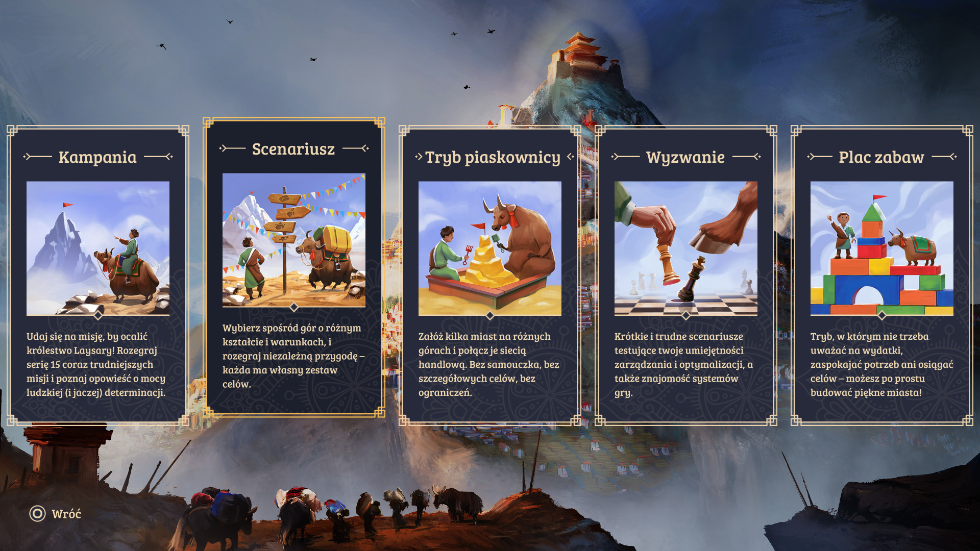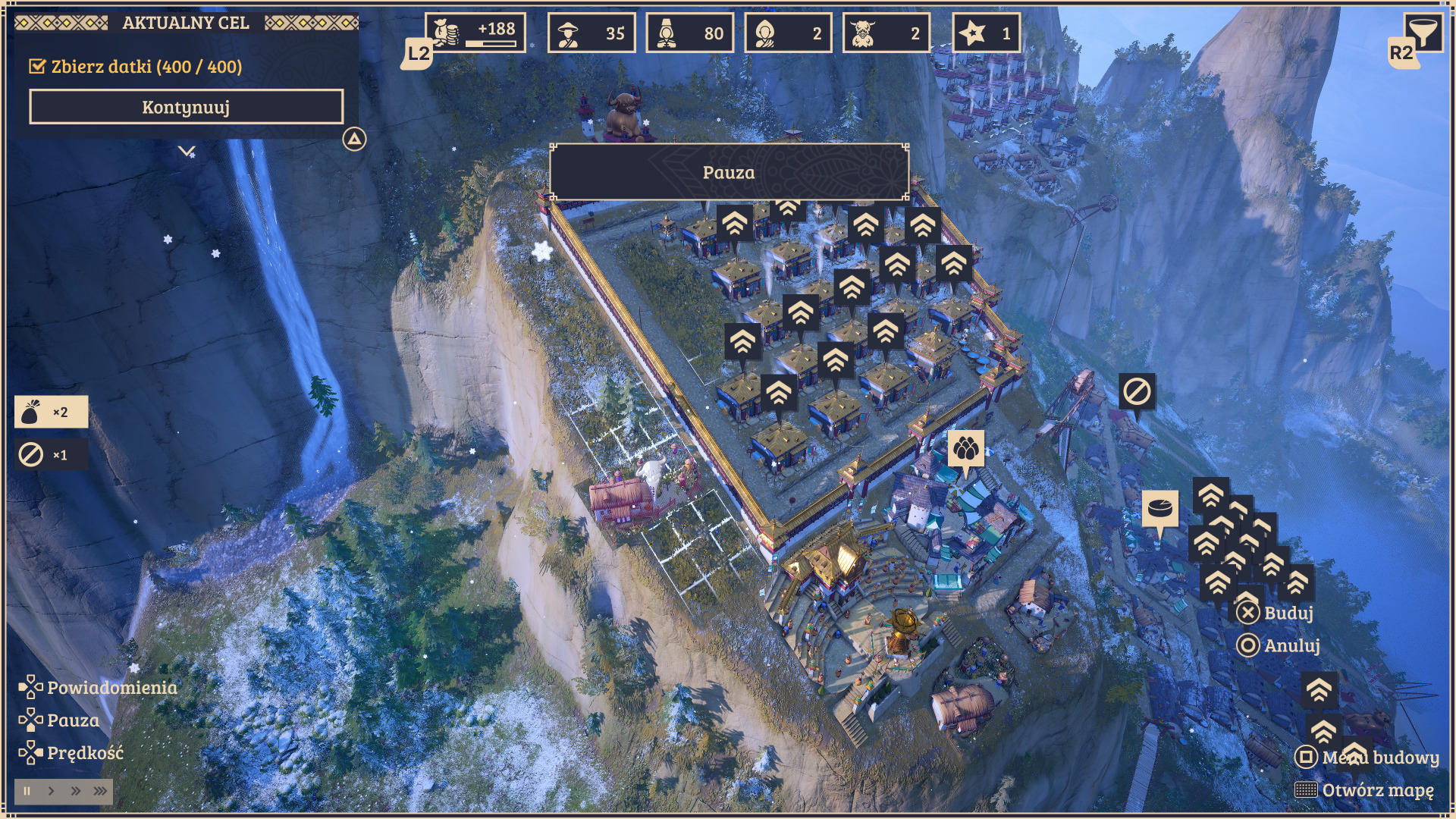 Laysara stawia bowiem na klimat Himalajów i gór właśnie. Naszym celem jest budowa metropolii na zboczach najbardziej zdradliwych szczytów świata, a celem nadrzędnym — budowa wspaniałej świątyni na najwyższym ze wszystkich szczytów! Cel może i szczytny (hehe), ale i wymagający, szczególnie biorąc pod uwagę zagrożenia w postaci lawin i konieczność skrupulatnego projektowania dzielnic w naszych miastach. Czy jednak sprawia to frajdę tak samo dużą, jak w innych City builderach?