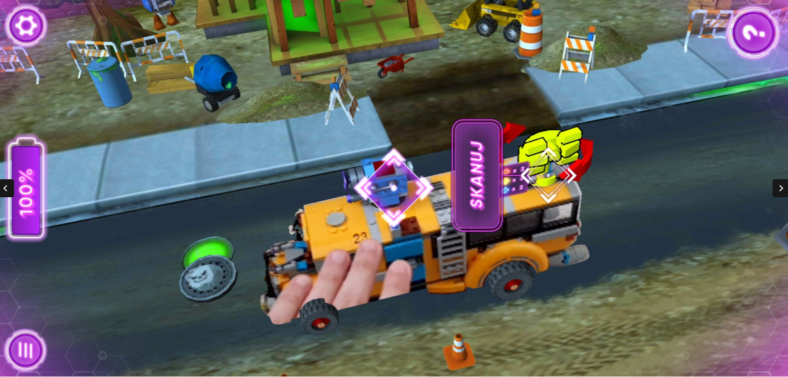 Co zaskakujące, LEGO Hidden Side nie korzysta z żadnych specyficznych nadruków na naszych klockach - nie ma żadnych kwadracików czy trójkącików, a zestaw rozpoznawany jest po... obrysie. Musimy najechać na niego pod odpowiednim kątem i dookoła zbuduje się wirtualny świat, a nasz zestaw będzie pokazywany z aparatu. Czasem gra na własne potrzeby dorysuje koła czy działo/satelitę, aby pokazać jakąś animację, ale zaskakujące jest, że komórka świetnie i płynnie radzi sobie z przechwytywaniem autobusu pod każdym kątem, gdy już raz go znajdzie. Można spokojnie chodzić dookoła i machać telefonem. Strzelam, że punktem odniesienia są niebieskie klocki na boku autobusu - nie mniej szacun, że to tak dobrze działa. Pamiętam w 2012 gdy próbowałem AR na PS Vicie i... no cóż, mimo kart z jakimiś ogromnymi dziwnymi kwadracikami, nie działało to najlepiej. Tutaj dostajemy niemal to, co PS4 potrafi z kamerą+dualschockiem, który przecież daje specjalne światło, a klocki tego nie robią.