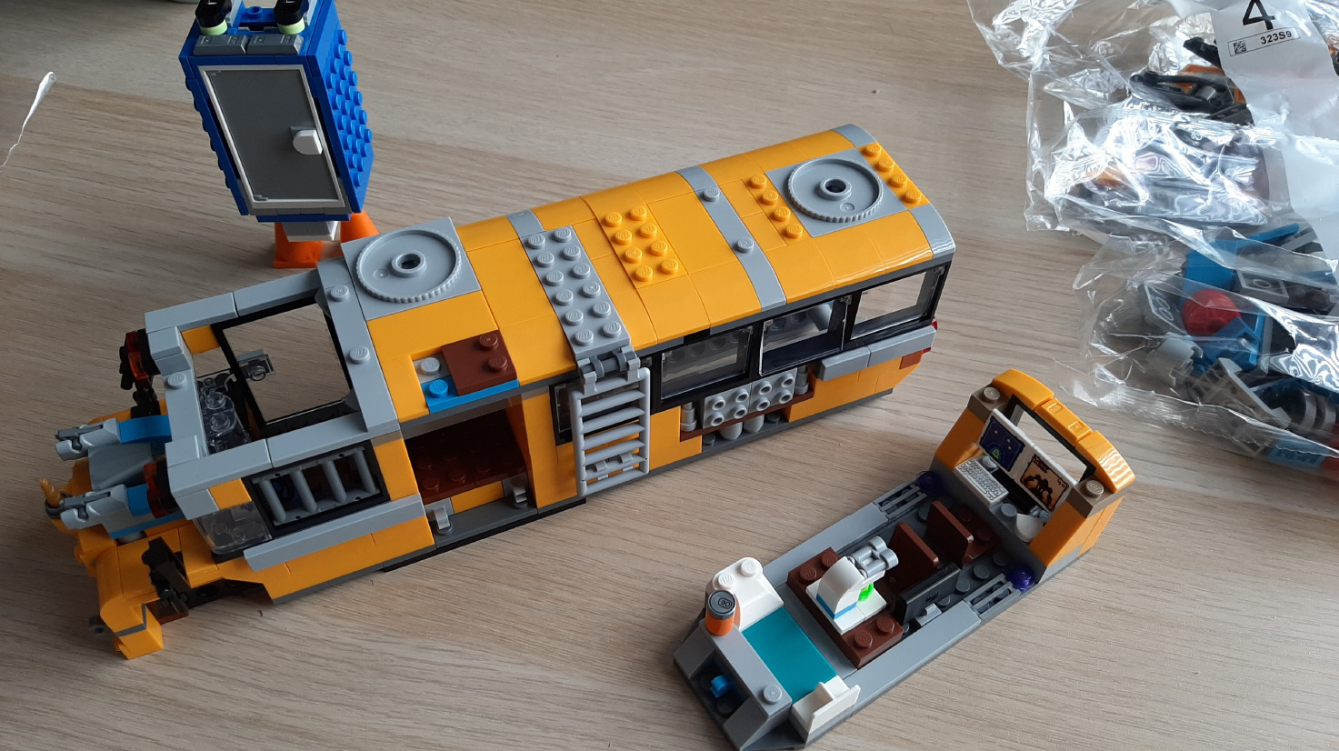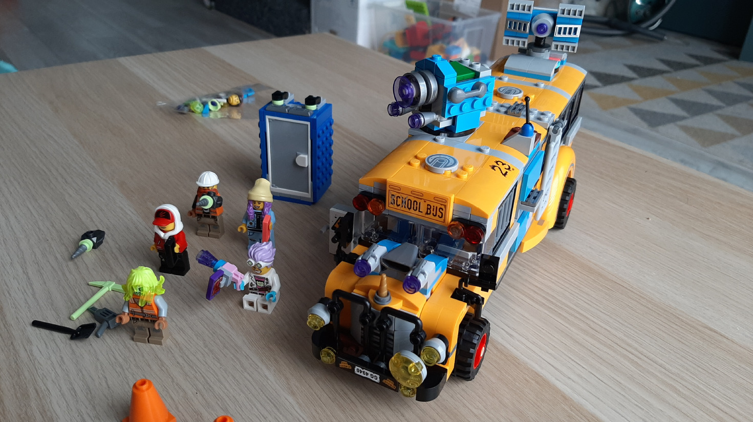 Najciekawsze części autobusu są jednak w piątym worku. To tutaj budujemy satelitę i działo, które pojawią się na dachu (oba elementy obrotowe) i które potem wykorzystamy w grze AR. Podstawa satelity posiada cztery różne kolory które potem wykrywać będzie gra i kazać nam obracać na konkretne z nich, aby kontynuować zabawę. Dwa kolejne działa/sonary (zależy od wyobraźni) schowane są w bocznych ścianach autobusu. To chyba jedyne miejsce, gdzie mam zarzut do autorów instrukcji, że nie zrobili zrzutu z góry, bo ciężko zgadnąć jak je zamontować - elementy trzeba wsadzić w "kółka" pod spodem innego elementu (a więc przesunięte o 50% względem normalnego łączenia klocków). Odkryjemy to próbując zamknąć drzwi.