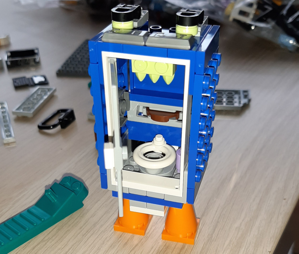 Pierwsza paczka to klocki do budowy... toi-toia. Tak, jak już wspomniałem w nagłówku, ten zestaw to chyba najbardziej "niegrzeczny" zestaw w historii Lego. Nie dość, że budujemy wychodek (jest deska klozetowa, jest sedes z dziurą...), to jeszcze dzięki specjalnemu klockowi w ścianie, możemy z niego strzelać płaskim, okrągłym elementem w kolorze brązu... który chyba ma być krowim plackiem. Cała budka skonstruowana jest tak, że chowa w sobie "oczy" i "zęby", więc obracając elementy nasz kibel może stać się nawiedzony i to tłumaczy też, po co mu możliwość strzelania kupą. Taki klocek leci spokojnie na 2-3 metry, trzeba więc uważać, żeby nie wpadł za szafę czy kanapę - i oczywiście nie strzelać w głowę czy oczy osób w domu (o czym informuje instrukcja).