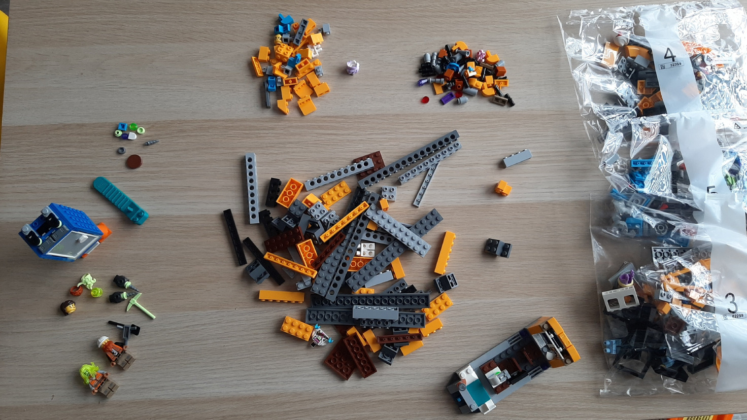 Karton jest ogromny (mniej więcej taki jak np. do Guitar Hero), a w nim znajdujemy 5 dużych ponumerowanych worków z klockami - numery odpowiadają oczywiście kolejności składania w instrukcji, otwieramy więc tylko jeden woreczek na raz wtedy, gdy książeczka nas o to poprosi. Przejście przez 130 stron instrukcji i złożenie całego zestawu zajmuje ok. 2h. Wiem, że sporo osób preferuje wysypanie klocków i dzielenie ich rozmiarami/kolorami, ale przy podziale aż na 5 worków (w każdym z nich są jeszcze 2 woreczki z małymi elementami), moim zdaniem wystarczy wysypanie tych trzech kupek na stół i spokojnie odnajdziemy każdy element w parę sekund. Autobus ma cztery główne warianty kolorystyczne - żółty (kukurydziany), szary, czarny i błękitny, więc sortowanie to naprawdę jedynie strata czasu. W każdym z worków znajduje się jedna minifigurka Lego i akcesoria dla niej (niektóre mają dodatkowe włosy/brody, jest też jedna dodatkowa głowa kobieca jeśli komuś za dużo będzie męskich ludzików ;) ).