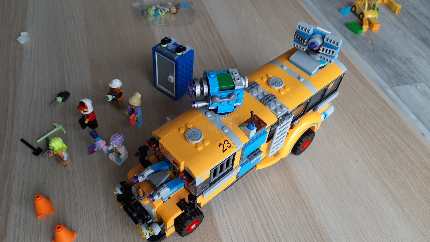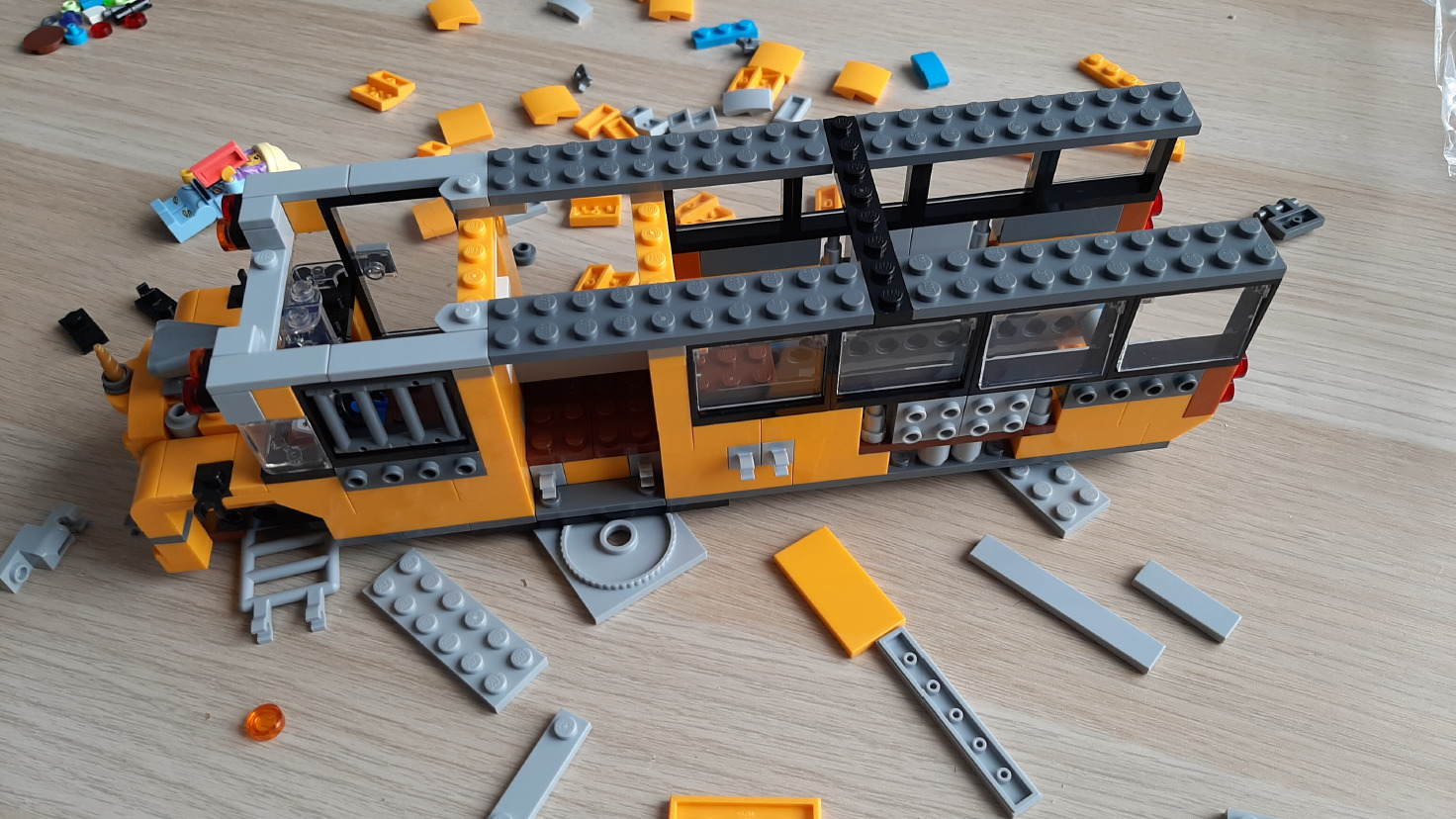 Od drugiej paczki zaczynamy budowę autobusu. Podwozie to element na którym najłatwiej się przejechać, gdyż składa się on z elementów Lego TECHNIC i wymaga wpinania pinów w otwory - łatwo się pomylić o jedno oczko, na szczęście w zestawie jest element do podważania i wyciskania elementów. Kilka razy mamy też do czynienia z momentami, gdzie część klocków "wisi" w powietrzu, a ponieważ elementy są długie, trzeba uważać, żeby sobie nie rozwalić konstrukcji - to właśnie ten moment, gdzie nerwowe odczepianie elementów w razie pomyłki nie jest wskazane. Gdy jednak już usztywnimy podwozie budowa idzie z górki i gwarantuję, że cały zestaw jak na standardy LEGO nie tylko trzyma się mocno, ale jest też wytrzymały. W samym autobusie jest sporo nietypowych klocków, które potem można wykorzystać w innych konstrukcjach - dużo ma "oczka" na swoich ściankach, pozwala więc zmieniać kierunek budowania. Jest też róg jednorożca na szczycie auta, drabinki i kraty, a nawet element w kształcie wałków do malowania ścian użyty jako lusterka. Autobus jest na tyle wielki, że wstawiamy do niego pełnowymiarowe drzwi od domów. Przyznam, że ten zestaw przypomniał mi czasy, gdy jako dziecko z klocków lego budowałem właśnie autobusy (i to przegubowe), ale wtedy nie wpadłem na to, ze dobry bus powinien być aż tak duży, jak ten. Przednia część dachu jest oczywiście przyczepiona na raptem dwa oczka, a reszta to elementy gładkie, aby można było go łatwo ściągać i posadzić za kierownicą jakiegoś ludzika. W tyle mamy też ogromne rury wydechowe, które spokojnie mogłyby robić za napęd w zestawach z Gwiednych Wojen.