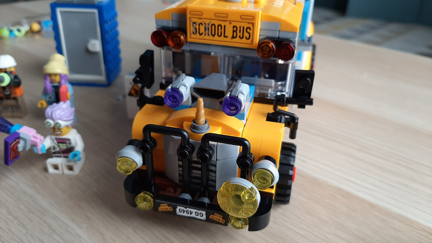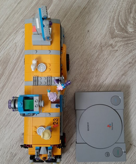Sam autobus jest ogromny - położone przy nim PSX Classic to mniej niż połowa długości. Sporo elementów jest ruchomych, obracanych i chowanych, na dachu jest parę miejsc gdzie można przypiąć ludziki, jest nawet drabinka z boku autobusu, aby któraś z 5 postaci mogła się jej złapać. Same minifigurki też są oryginalne - poza zjawami z przeźroczystymi zielonymi głowami i włosami, dostajemy grupkę ziomków i szaleńców - moje ulubione trzy to chłopak-dres z kapturem na głowie, dziewczyna w czapce smerfów z fioletowymi włosami oraz szalona wynalazczyni z krótkich nażelowanych włosach z różowym pistoletem. I to nie dla tego, że lubię róż, ale widać, że LEGO idzie w odważne i jaskrawe kolory, których kiedyś czasem brakowało. Większość ludzików z racji włosów ma też namalowaną z tyłu głowy drugą, przerażoną twarz - można więc spokojnie odgrywać scenki, gdy na arenę zabawy wkraczają duchy.