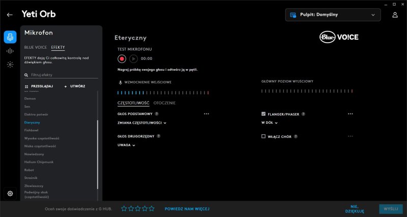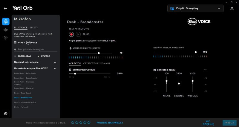 Pora przejść do najważniejszej kwestii, a mianowicie jakości rejestrowanego głosu. Domyślam się bowiem, że większość z Was nie planuje bowiem kupna mikrofonu w celach ozdobnych. Z recenzowanego sprzętu możemy korzystać od razu po wyciągnięciu z pudełka, jednak pełnię jego możliwości poznamy dopiero po ściągnięciu dedykowanej aplikacji Logitech G HUB. Zalecam korzystanie ze wspomnianego oprogramowania, ponieważ umożliwia nam ono uruchomienie funkcji Blue Vo!ce.