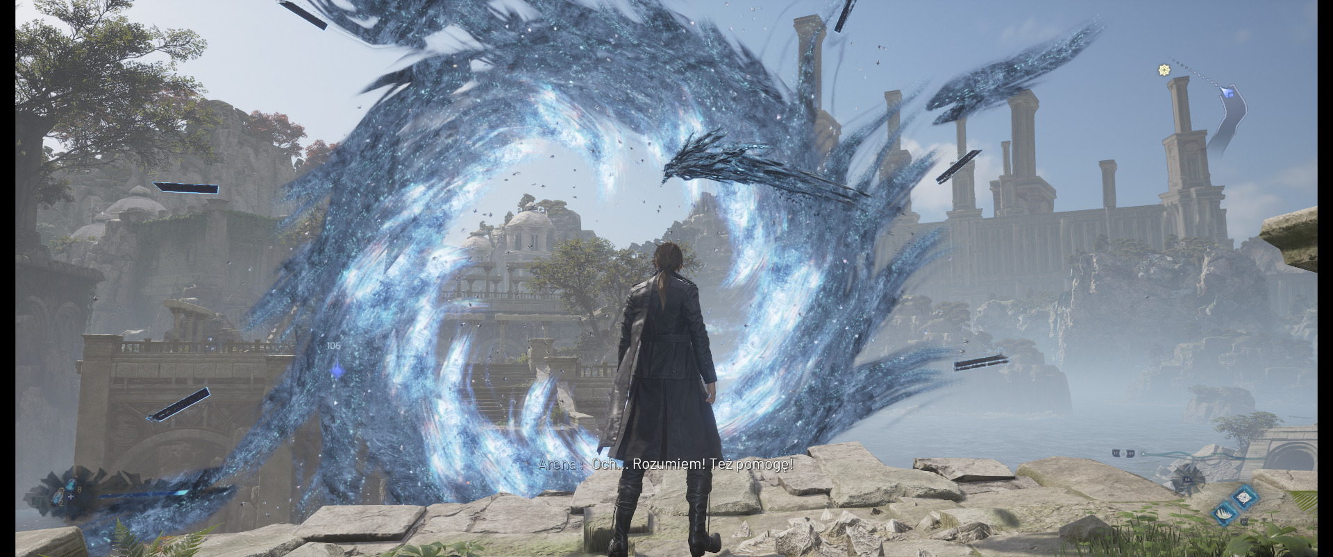 Trochę lepiej robi się po połączeniu z Areną, dzięki czemu zyskujemy dostęp do postawy miecza jednoręcznego. Starcia stają się znacznie bardziej dynamiczne, a unik i blok wykonane w idealnym momencie skutkują widowiskowymi kontrami.