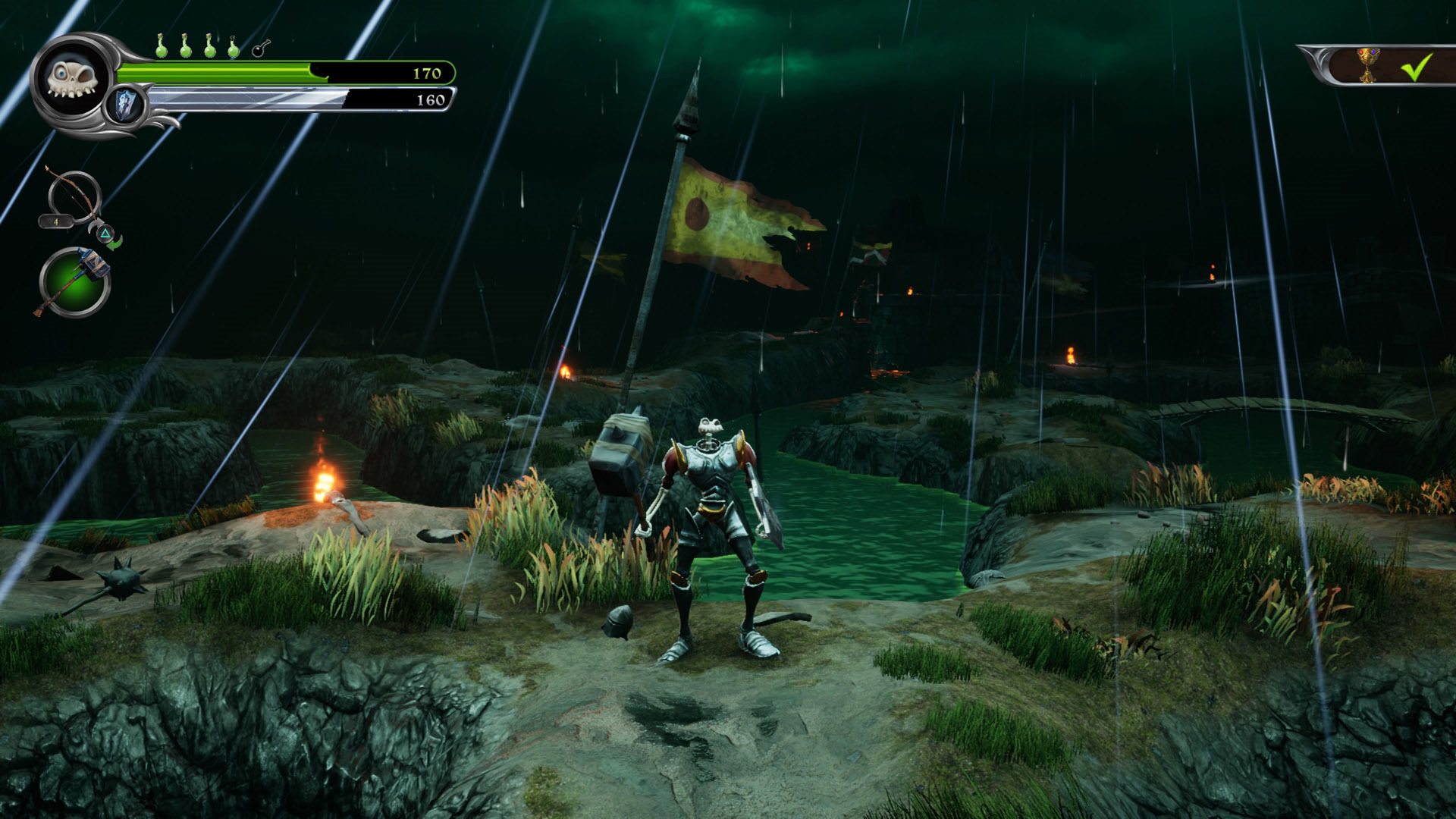 Sytuację ratuje fakt, iż rodzajów przeciwników i broni jest całe mnóstwo, toteż walka choć nieco prymitywna raczej szybko się nam nie znudzi. Co ważne oba te elementy są odpowiednio różnordodne. Nie mamy więc do czynienia z prostym kopiuj/wklej, ale rzeczywiście unikalnymi rodzajami zarówno narzędzi destrukcji jak i wrogów. Jednego pokonamy zaklętą rękawicą ciskając w niego błyskawicami z odległości, na drugiego, szybującego na niebie najrozsądniej przygotować będzie łuk z ognistymi strzałami, a wielkiego rycerza z pokaźnym kałdunem wyeliminować da się jedynie spychając go młotem do wody. Każdą bronią gra się trochę inaczej co zapewnia niepowtarzalne doświadczenia. Są takie, które pozwalają na wykonywanie szybszych ciosów, z kolei inne mają większy zasięg ataku. Możliwości jest więc całkiem sporo i warto przetestować wszystkie, by znaleźć tą, która najbardziej pasuje do naszego stylu gry, choć z racji małego skomplikowania mechaniki może się szybko okazać, iż w starciu z bardziej standardowymi odmianami stworów niektóre wyraźnie górują nad innymi.