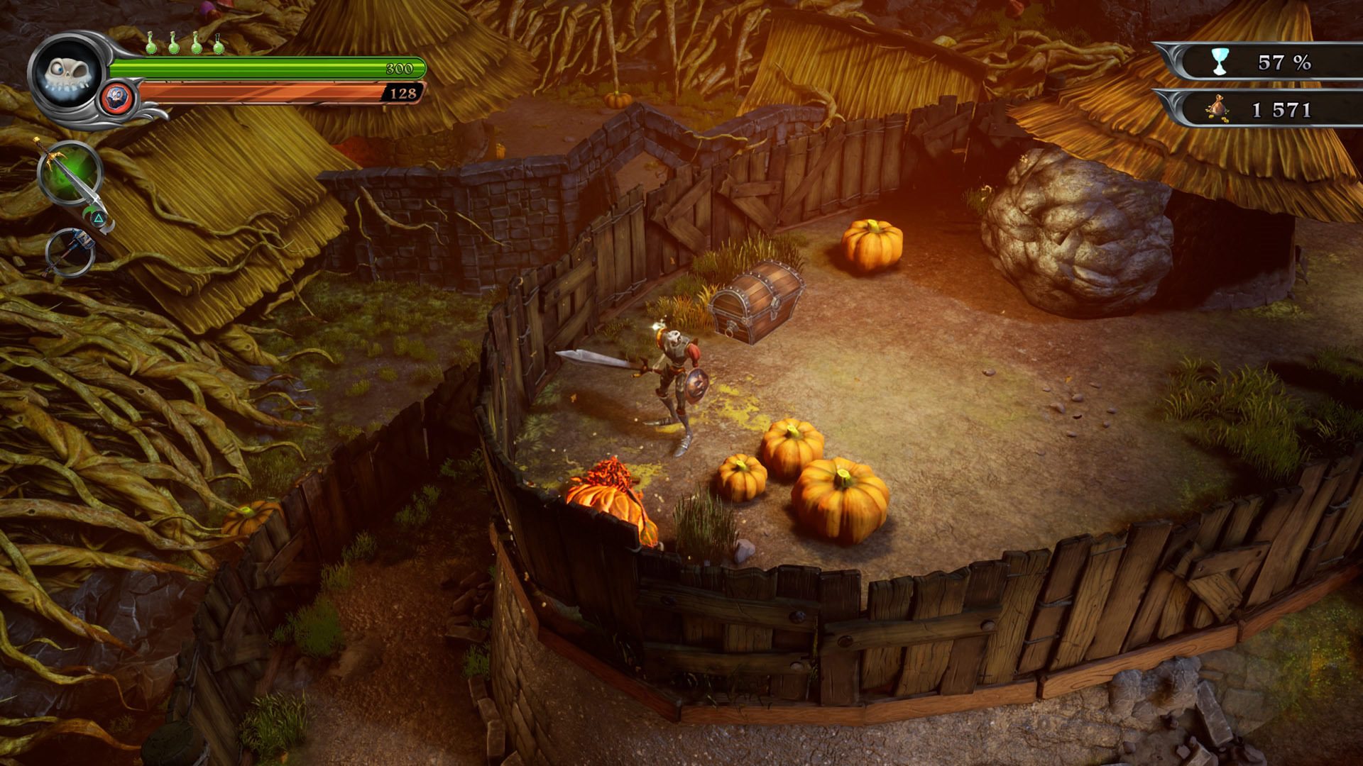 Między innymi dlatego MediEvil jest dość typowym przedstawicielem starej szkoły gier platformowych. Zabawę prowadzimy obserwując naszego kościanego progatonistę z trzeciej osoby, siekając przeciwników pokaźnym arsenałem dostępnych broni białych oraz dystansowych. Wśród nich znajduje się nawet nasze własne ramię, jakie możemy w chwili zagrożenia oderwać, by w stylu rambo nabijać nim wrogom na głowach sporawe guzy. Trzon rozgrywki stanowi więc walka i eksploracja kolejnych naszpikowanych sekretami poziomów, które tylko czekają, by nagrodzić dociekliwego gracza specjalnymi przedmiotami, bądź też złotem. To ostatnie wykorzystamy do uzupełnienia amunicji oraz naprawy broni.