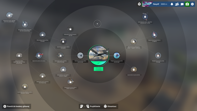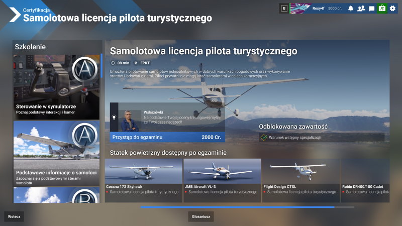 Aby móc podbijać przestworza, musimy najpierw przejść przez szereg szkoleń zakończonych egzaminem na samolotową licencję pilota turystycznego. Dla tych, co nie wiedzą — w prawdziwym życiu jest dokładnie tak samo. Oczywiście dochodzą do tego egzaminy z prawa lotniczego i badania lekarskie, ale tym sobie nie musimy zaprzątać głowy w przypadku symulatora. Nic nie stoi na przeszkodzie, aby pominąć pojedyncze sekcje szkoleniowe i spróbować od razu zdać dany egzamin, jednak szkolenia są na tyle w mojej ocenie istotne, że dla kogoś nieznającego realiów pilotażu, będą one niezbędne.