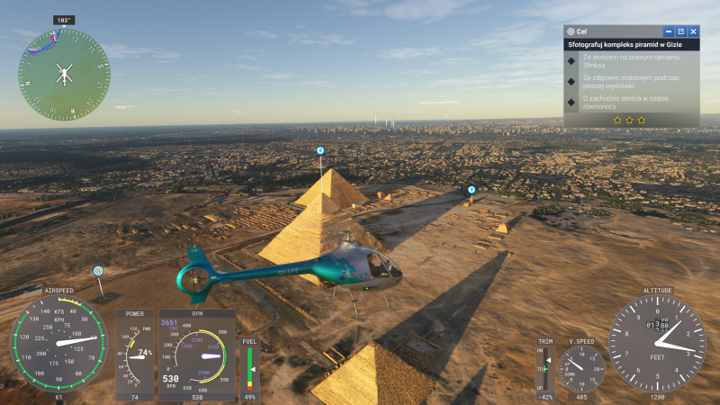 Nareszcie z uśmiechem na twarzy mogę powiedzieć, że mimo iż wirtualnie, to mogę sobie polatać nad własnym domem i rozpoznawać każde miejsce. Po prostu wow! W grze nie zabrakło trybu fotograficznego, który jest dostępny w dowolnym momencie podczas rozgrywki, ale tutaj z niego postanowiono także zrobić specjalny tryb wyzwań, który jest powiązany z plane spottingiem oraz odwiedzaniem najbardziej znanych turystycznych miejsc na świecie, jak np. egipskie piramidy. Po wylądowaniu możemy również przejść się na piechotę, co jest istotne dla uchwycenia konkretnych kadrów, aby zaliczyć wszystkie wyzwania fotograficzne danej lokacji.