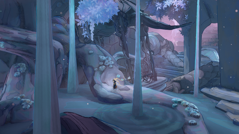 Tym za co chciałbym wyróżnić MIO, jest przepiękna oprawa audiowizualna. Graficznie otrzymujemy zachwycające 2,5-wymiarowe tła w ręcznie rysowanej stylistyce o akwarelowej kolorystyce. Świat jest bardzo różnorodny i bogaty w detale, dzięki czemu odwiedzanie każdej lokacji robi ogromne wrażenie. Tam, gdzie rozgrywka niedomaga, nadrabia artyzm i widać, że zespół odpowiedzialny za styl artystyczny wykonał swoje zadanie niebywale dobrze. Twórcy świetnie budują nastrój poprzez kolorystykę, wchodząc również w mocne czarno-białe odcienie.