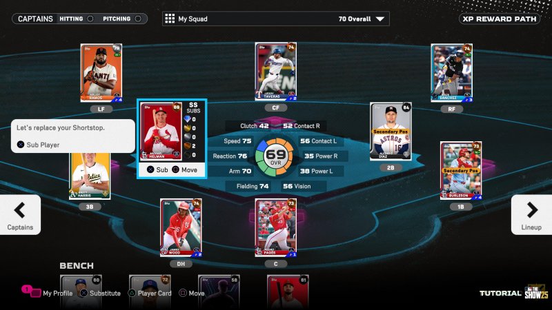 Fani zbierania kart i budowania własnej drużyny również będą usatysfakcjonowani. Wszystko za sprawą Diamond Dynasty, który jest baseballową wersją Ultimate Team znanego z serii FIFA/EA FC. Możemy w nim rozgrywać kolejne mecze i wykonywać zadania, za które otrzymuje wirtualną walutę, wymienialną na nowe paczki kart, zawierające słabszych lub mocniejszych zawodników do naszej drużyny. Osobiście bardzo przypadło mi do gustu wyzwanie o nazwie Diamond Quest, będące baseballową wariacją gry typu roguelike, w którym musimy rzucać kostką i przemierzać stylizowany na stadion loch.