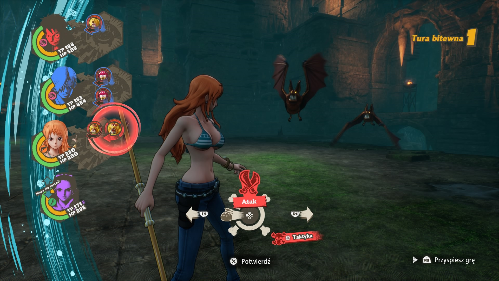 Przejdźmy więc do tego, co spodoba się i osobom które znają serię i które mają do czynienia z nią pierwszy raz. W One Piece Odyssey walczymy w turowym systemie, ale względem tego co zazwyczaj dostajemy w podobnych grach, są tu pewne zmiany. Chociażby brak punktów MP, które zastąpiono TP - zamiast jednak je leczyć miksturkami (chociaż i tak się da), zdobywamy je także atakując przeciwników. Możliwość zadawania silniejszych ataków jest więc nagrodą za wcześniejsze ich młócenie. Techniki mają świetne animacje, oraz zabawne nazwy (które postaci wypowiadają na głos), co z początku jest bardzo zabawne.