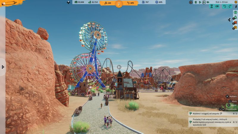 Tryb piaskownicy nawet daje radę. Oczywiście o ile całkowicie wyłączymy ekonomię, ograniczając grę wyłącznie do trybu budowania jak najładniejszego parku rozrywki. Dekoracji nie ma przesadnie dużo, i warto zaznaczyć, że nie mają one absolutnie żadnego wpływu na postrzeganie parku przez odwiedzających. Warto wyłączyć kupowanie kolejnych działek, bo łatwo trafić na błąd, który blokuje kursor kontrolera. Jedynym sposobem na kontynuowanie jest podłączenie myszki, co zmienia interfejs i pozwala swobodnie poruszać się po menu. Warto mieć ją pod ręką, bo to nie jedyna sytuacja, gdy konieczne jest korzystanie z dodatkowego sprzętu.