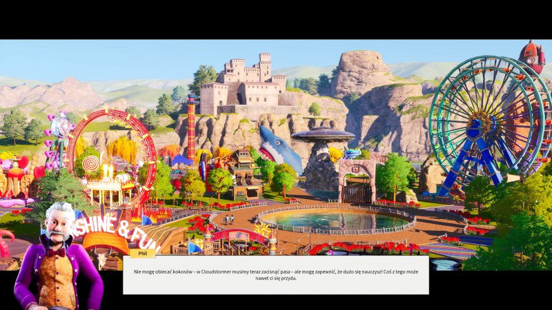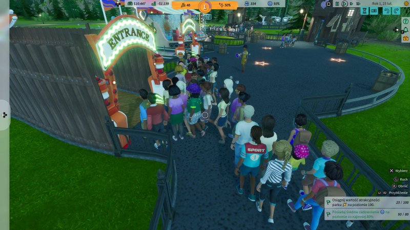 Z trybem kampanii to dopiero jest hit, bo w tym momencie jest on praktycznie niemożliwy do ukończenia. Całość to zaledwie osiem misji wypełnionych paskudnej jakości modelami postaci oraz wywołującymi zażenowanie nieśmiesznymi dialogami. Zbadałem sprawę bardzo dokładnie i na ten moment jest gigantyczny problem, by ukończyć dwa ostatnie poziomy. Głównie z powodu problemów natury technicznej, o których cały czas wspominam. Pomysł na odblokowywanie kolejnych etapów misji jest całkiem prosty, ale wykonany tak dziwnie, że nie da się tego zrozumieć. Poziom parku to jego atrakcyjność, czyli suma dwóch statystyk — frajdy oraz czystości. Odblokowanie nowych karuzel czy obiektów gastronomicznych wymaga awansowania na kolejne etapy. Higiena, choć potrafi płatać figle i w jednej chwili zmienić się z 90 do 70%, to jest do opanowania. Dużo większym problemem jest frajda zyskiwana za każdym razem, jak ktoś korzysta z kolejki. Średnia frajdy skacze bez przerwy w sposób nie do opanowania. W jednym momencie 500, w innym 420, potem 510 i znowu 440. Awans wymaga określonej atrakcyjności parku, więc trzeba bez przerwy gapić się na ten licznik i mieć nadzieję, że generator liczb losowych podrzuci wysoki wynik. A tak na poważnie, to budować wszystkie możliwe karuzele i liczyć, że przybędzie ochotników. To oczywiście zwykle również nie działa, tak jak powinno. Zbudowanie trzech nowych atrakcji sprawiło, że frajda spadła o 120 punktów. Ostatnie misje trybu fabularnego, to wyzwania czasowe i jeden błąd może sprawić, że konsekwencją będzie restart, lub szukanie poprawnie działającego zapisu. Nieczytelne statystyki powodują, że ciężko wybrać strategię, której można się trzymać. Jedyną faktyczną pomocą jest społeczność szukająca sposobu, by oszukać nieogarnięte AI.