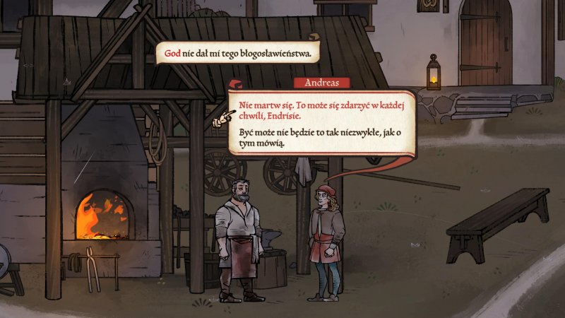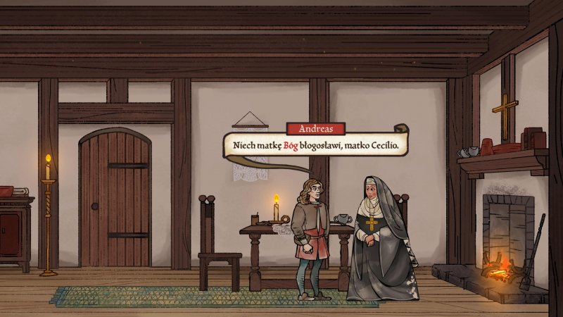 Tym, co bez wątpienia przykuwa uwagę, jest wyjątkowy styl artystyczny, który – jak wspomniałem we wstępie – błędnie oceniłem jako mobilny. Wybrana stylistyka została zainspirowana ilustrowanymi manuskryptami oraz najwcześniejszymi drukowanymi książkami i idealnie wpasowuje się do świata gry. Warto zwrócić uwagę jak wykonany został w grze sam tekst. Czcionki, w jakich pojawiają się dialogi są dopasowane do tego jak Andreas ocenia umiejętność pisania, status społeczny i poziom edukacji rozmówcy. Słowa święte takie jak Bóg czy Chrystus zawsze pojawiają się na samym końcu, w innym kolorze co nawiązuje do tradycji odróżnienia ich od reszty tekstu. Pełno jest również zamierzonych błędów ortograficznych, które poprawiane są automatycznie w trakcie czytania. Ilość detali włożonych do tak prostej czynności jak wyświetlanie tekstu jest absolutnie niezwykła.