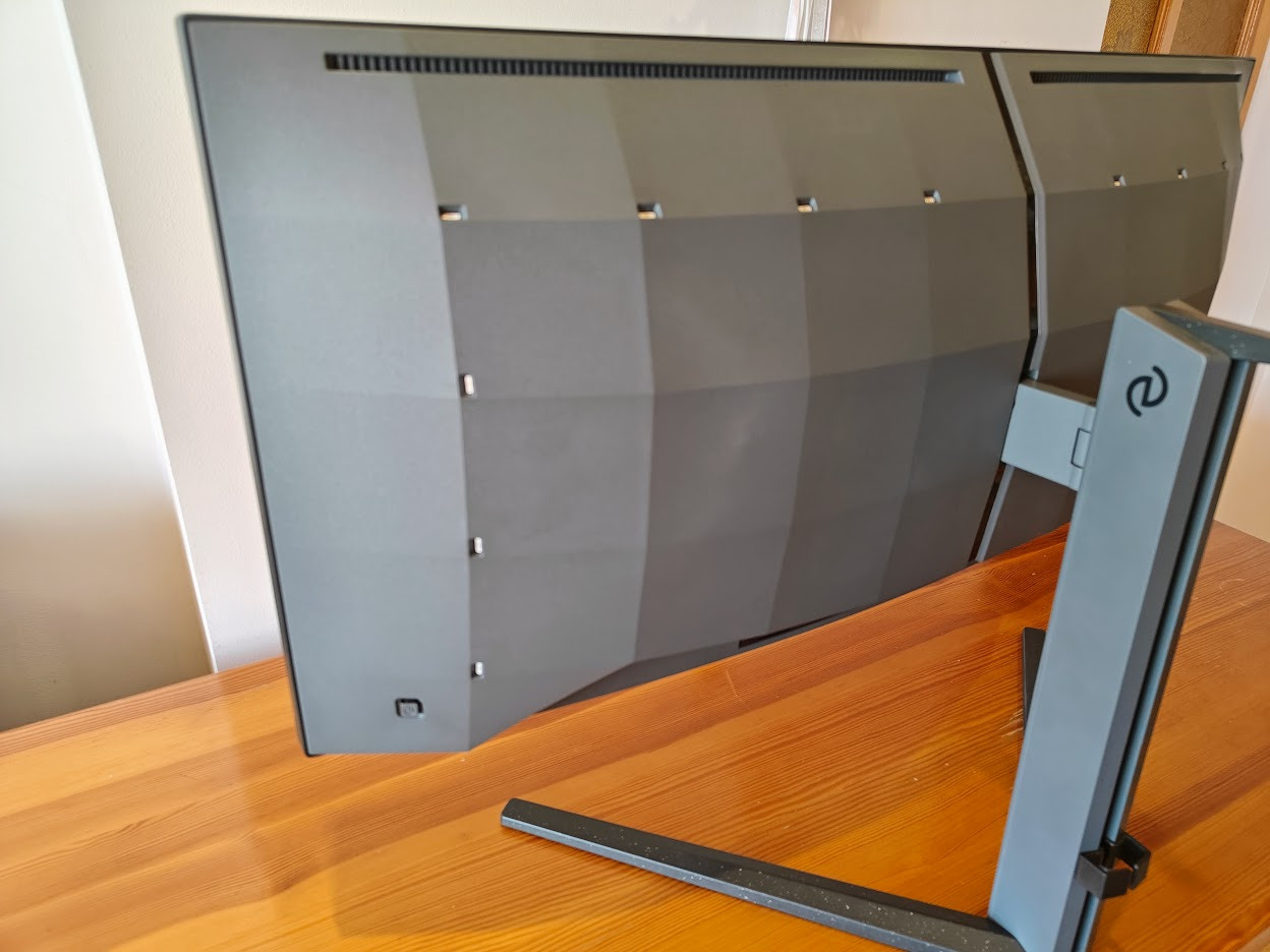 Znacznie gorzej jest jednak z samą podstawą. Po pierwsze, jest gigantyczna. Nie tylko zajmuje mnóstwo miejsca na biurku, ale przez to, że nie jest płaska, utrudnia zagospodarowanie miejsca pod monitorem. Po drugie, to chyba najbrzydsza podstawa, jaką kiedykolwiek widziałem. Ze względu na dziwaczny wzór, właściwie zawsze wydaje się być brudna.