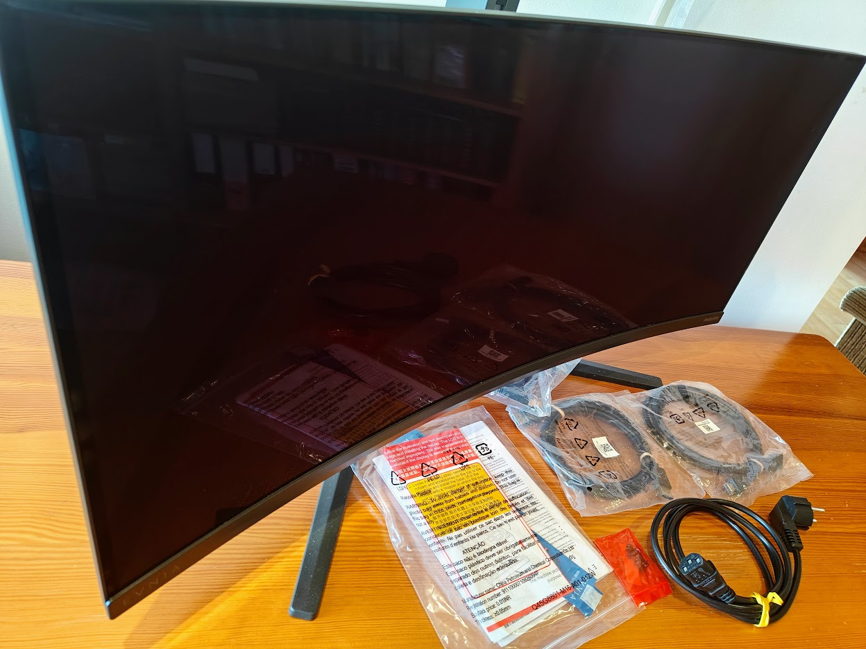 W środku, poza samym monitorem, znajdziemy ramię, podstawę, przejściówkę do standardu VESA oraz zestaw przewodów, czyli HDMI, DisplayPort, USB-B i kabel zasilający. Nie zabrakło też obowiązkowej papierologii, której i tak pewnie nigdy nie otworzycie.