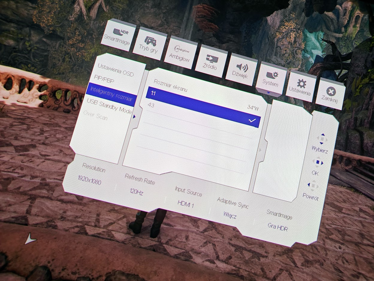 W oprogramowaniu pokładowym, jakim zarządzać możemy, korzystając z umieszczonego na tyle obudowy joysticka, znajdziemy szereg mniej lub bardziej gamingowych funkcji. Zmienimy tutaj ustawienia podświetlenie Ambiglow, przełączymy funkcje Picture-by-Picture (PBP) lub Picture-in-Picture (PIP) (obie bardzo przydatne na tak szerokim ekranie), uruchomimy technologię Shadow Boost czy zmienimy widoczność celownika na środku ekranu.