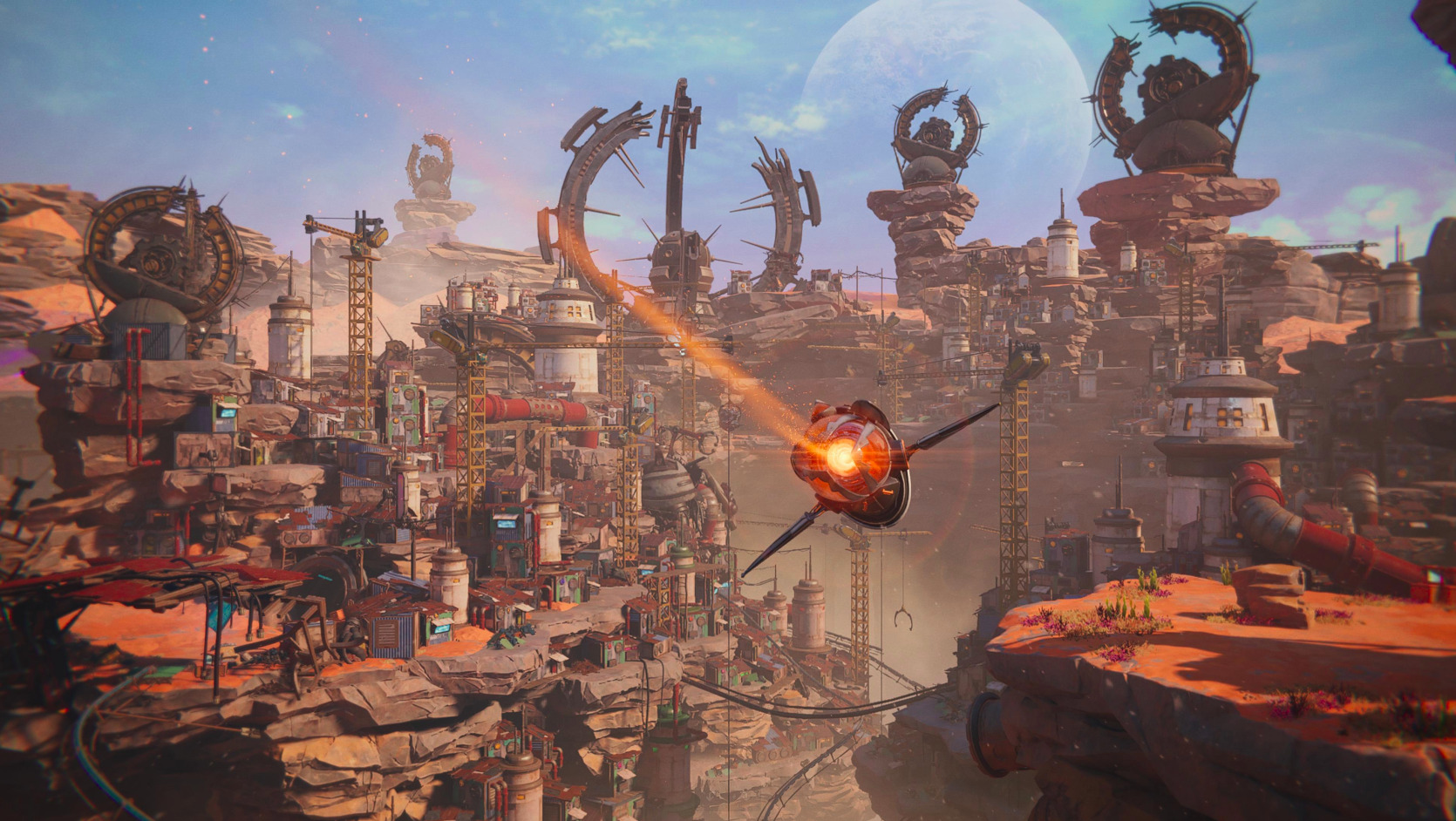 Wrócę jednak do tego, jak gra wykorzystuje wszystkie zalety PS5. Etapy oczywiście wczytują się ekspresowo. Jest co prawda maskowanie przemieszczania się między nimi w postaci animacji lotu kosmicznego, ale… da się to pominąć w menu pauzy i traktowane jest jako cutscenka. Wczytywanie etapów trwa więc generalnie 1 sekundę, a najciekawiej robi się, gdy pojawiają się wyrwy czasoprzestrzenne. Tych są trzy rodzaje - przypominające te z gry Portal, które pozwalają nam przejść do innego miejsca w tym samym etapie, z poboczną międzywymiarową sekcją w której ukryte są śrubki czy elementy pancerza, oraz wyrwy przechodzące przez inne etapy. W tych ostatnich widać co prawda, że przeskakując między etapami następuje przeskoczenie gry o jedną klatkę obrazu (jakby się nie wyświetliła), a w nowym obszarze przed wejściem do niego cienie mają zazwyczaj znacznie krótszy dystans rysowania (doładowują się właśnie w trakcie tej jednej klatki, co potęguje efekt przeskoku), ale to zapewne wina zarządzania zasobami i wywalania/wrzucania do pamięci setek megabajtów danych. To niski koszt w zamian za efekt… Zupełnie jednak nie widać tego w etapach, które podobnie jak w grze Soul Reaver pozwalają przemieszczać się pomiędzy wersją dwóch światów - Ratcheta i Riviet - zazwyczaj w jednym z nich dana planeta jest zniszczona lub popadła w ruinę, a w drugim tętni życiem. Dysk SSD sprawia, że portale i przechodzenie między światami jest niezauważalne i aż szkoda, że gra nie jest dłuższa, żeby z tego zabiegu skorzystać jeszcze parę razy.