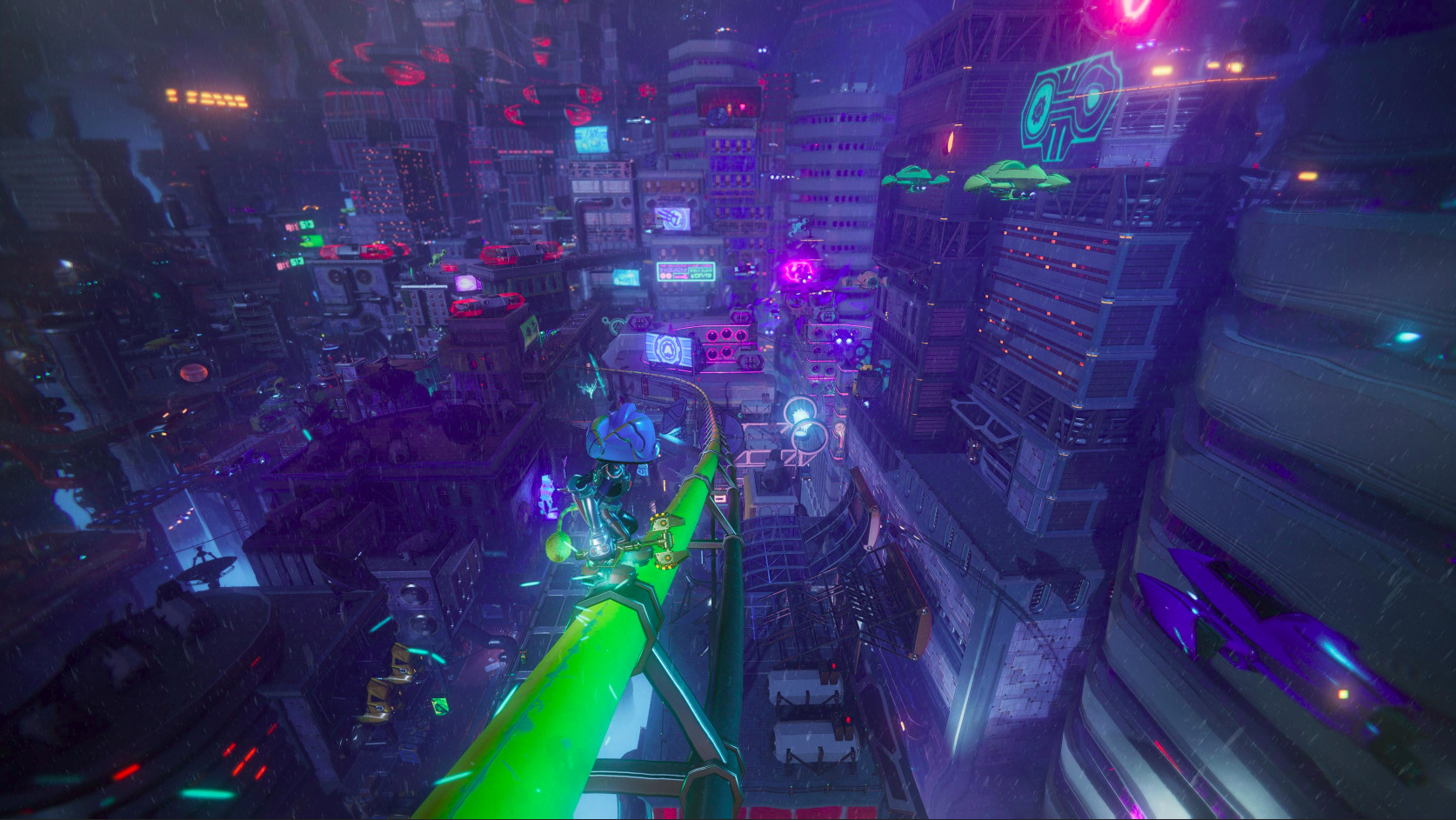 Przede wszystkim, w tej grze absolutnie wszystkie tekstury są w najwyższej możliwej rozdzielczości. Nie ma w ogóle takiego miejsca, gdzie bylibyśmy w stanie zauważyć jakikolwiek samotny piksel, nie ma nawet takiego, gdzie te piksele są rozmyte - każda tekstura jest maksymalnie ostra i szczegółowa. Bogata jest też geometria obiektów - zaskakują zwłaszcza obłe obiekty, na których nawet na ostatniej generacji wciąż było widać polygony - tutaj siatki obiektów są tak gęste, że każda zaokrąglona powierzchnia jest pozbawiona jakichkolwiek rantów, a nawet najdrobniejsze śrubeczki czy wgłębienia w podłożu generowane już tylko bump mappingiem a nie faktycznymi polygonami są tak dokładne, że wciąż są idealnie okrągłe - gdy odpaliłem Ratcheta z 2016 roku te same miejsca były albo sześciokątne, albo ząbkowały sporymi pikselami - tu mamy jednak poziom znany z animacji kinowych i myślę, że nie skłamię, twierdząc, że Rift Apart graficznie jest lepsze niż pierwsze filmy Pixara z lat '90.