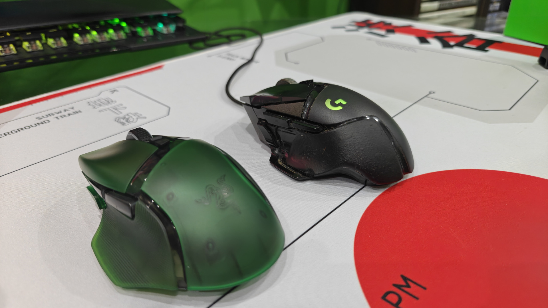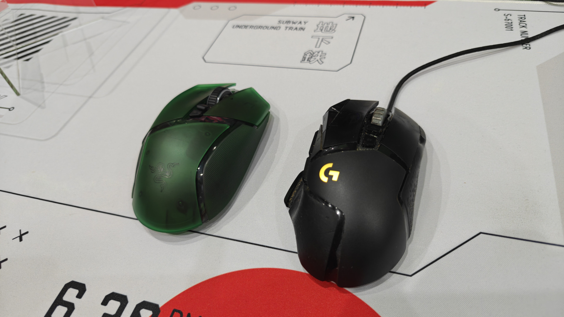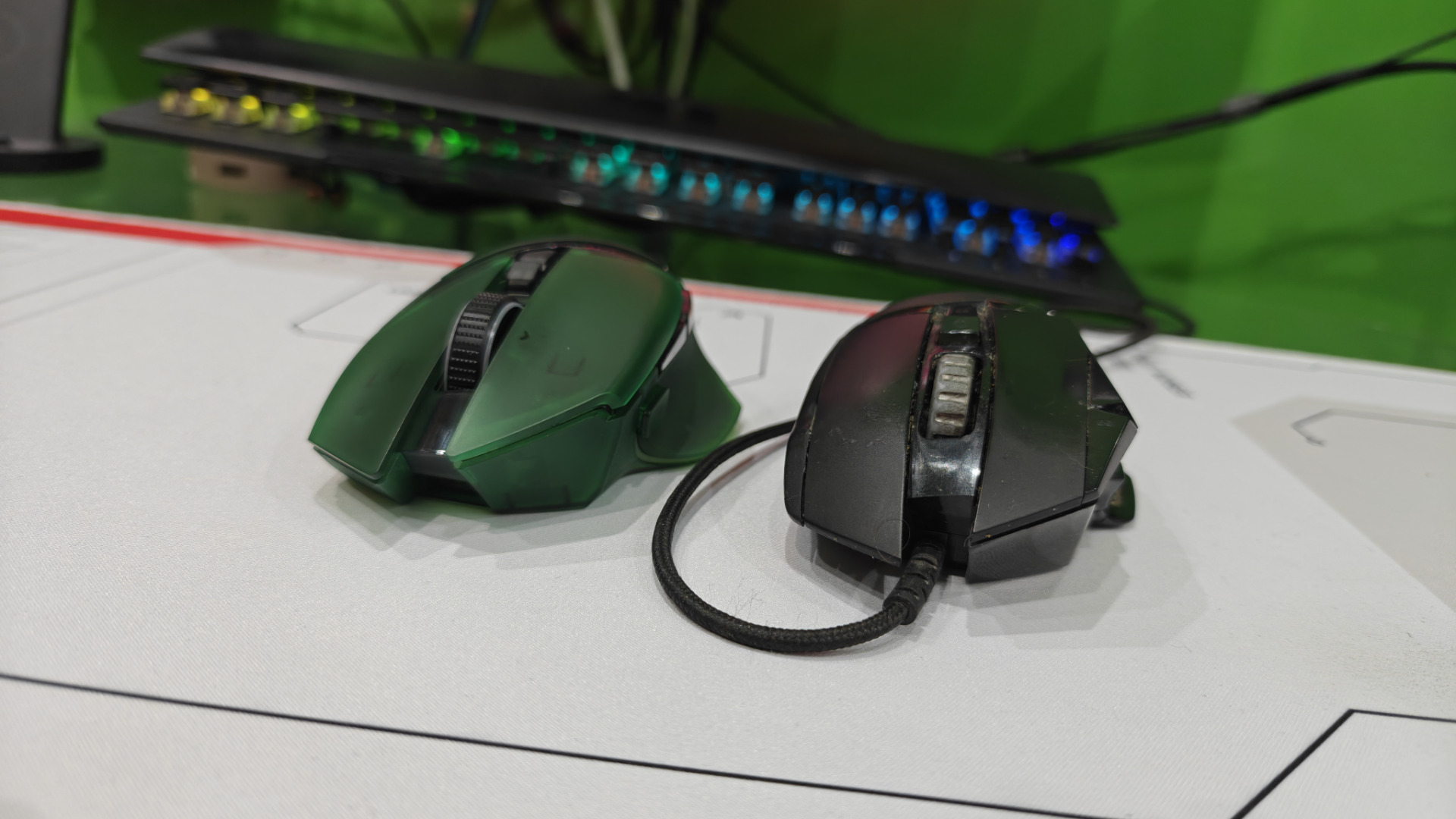 A właśnie, mówiłem już, że mysz jest bliźniaczo podobna do mojego prywatnego Logitech G502 Hero? Na zdjęciu poniżej możecie zobaczyć sobie bezpośrednie porównanie. Zupełnie nowy Razer Basilisk V3 Pro 35K Phantom Edition, a obok 8-letni bardzo strudzony nieustanną pracą Logitech G502 Hero. Podobieństwo jest uderzające, prawda?