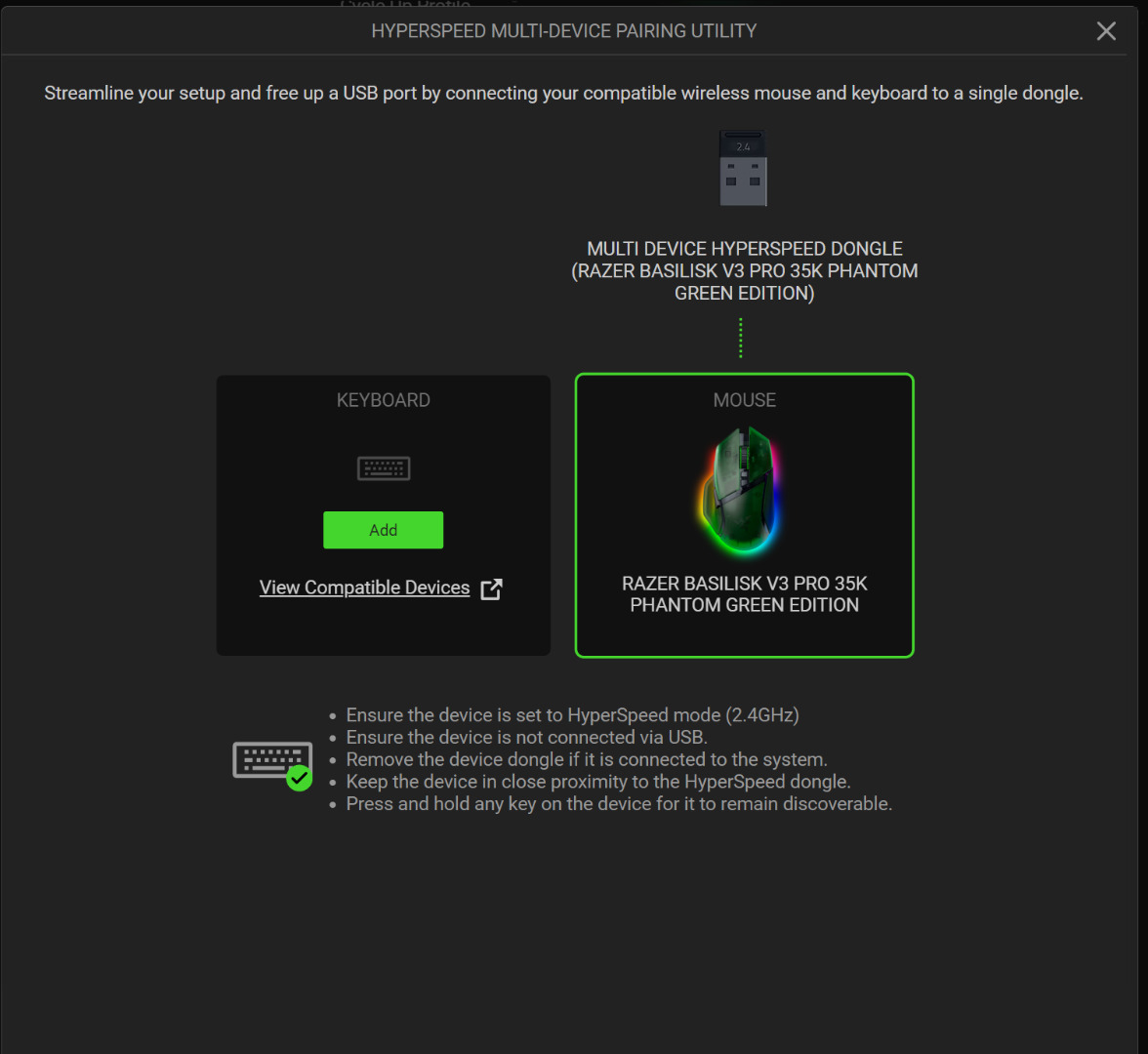 Ale to nie koniec, mysz jest napakowana najnowocześniejszą technologią, którą teraz przetestujemy. Na początek opcja multi-parowania urządzeń do jednego odbiornika. Razer oferuje możliwość parowania bezprzewodowej myszy oraz bezprzewodowej klawiatury do JEDNEGO odbiornika. Macie więc dwa urządzenia w jednym porcie USB, co pozwala zaoszczędzić miejsce. Rozwiązanie bardzo sprytne i chciałbym je przetestować.