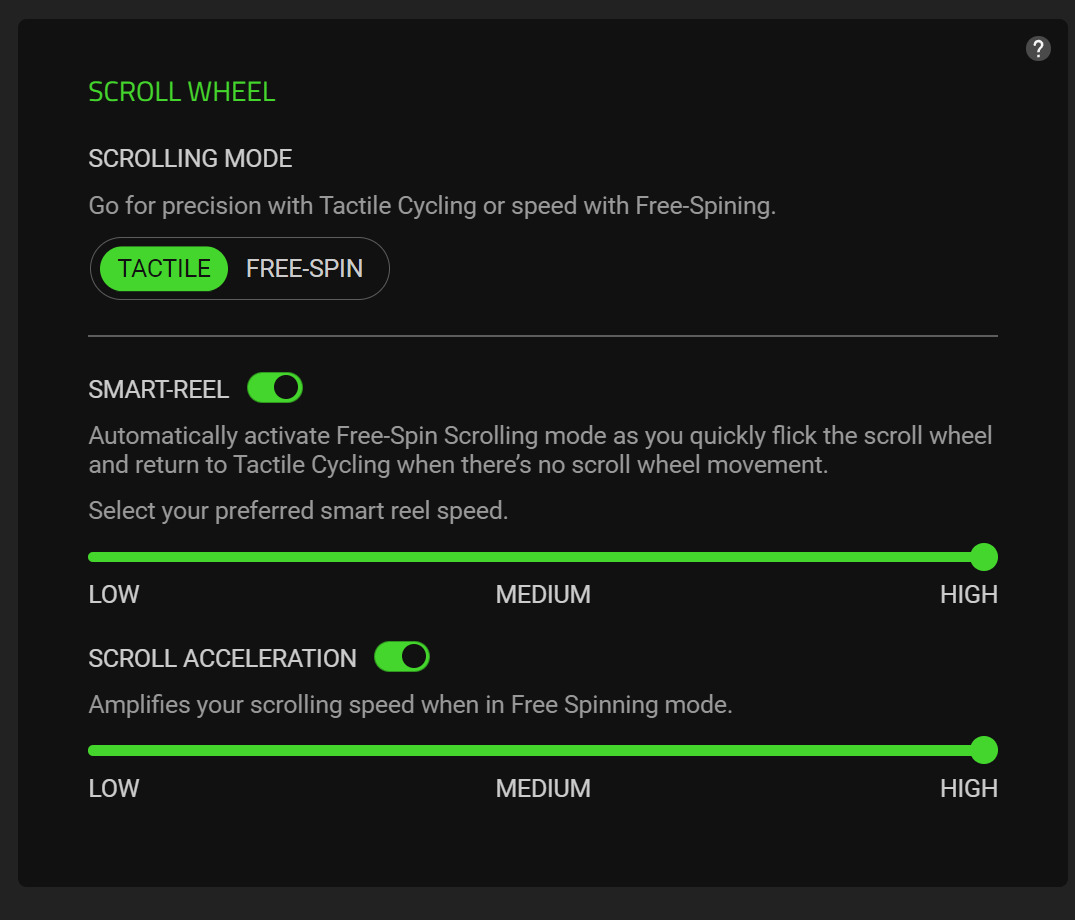 Ostatnia kwestia to technologia Smart-Reel. Mysz jest wyposażona w tradycyjny scroll, który stawia opór, ale możemy przełączyć go w tryb swobodny, bez oporu, który pozwala nam błyskawicznie scrollować długie dokumenty. Takie rozwiązanie znajdziemy, chociażby w myszkach Logitech. W czym więc Razer zabłysnął? A gdyby tak oprogramowanie samo wykrywało prędkość naszego scrollowania i automatycznie uruchamiało swobodny scroll gdy szybko kręcimy gałką? Dobrze skojarzyliście — to właśnie Smart-Reel.