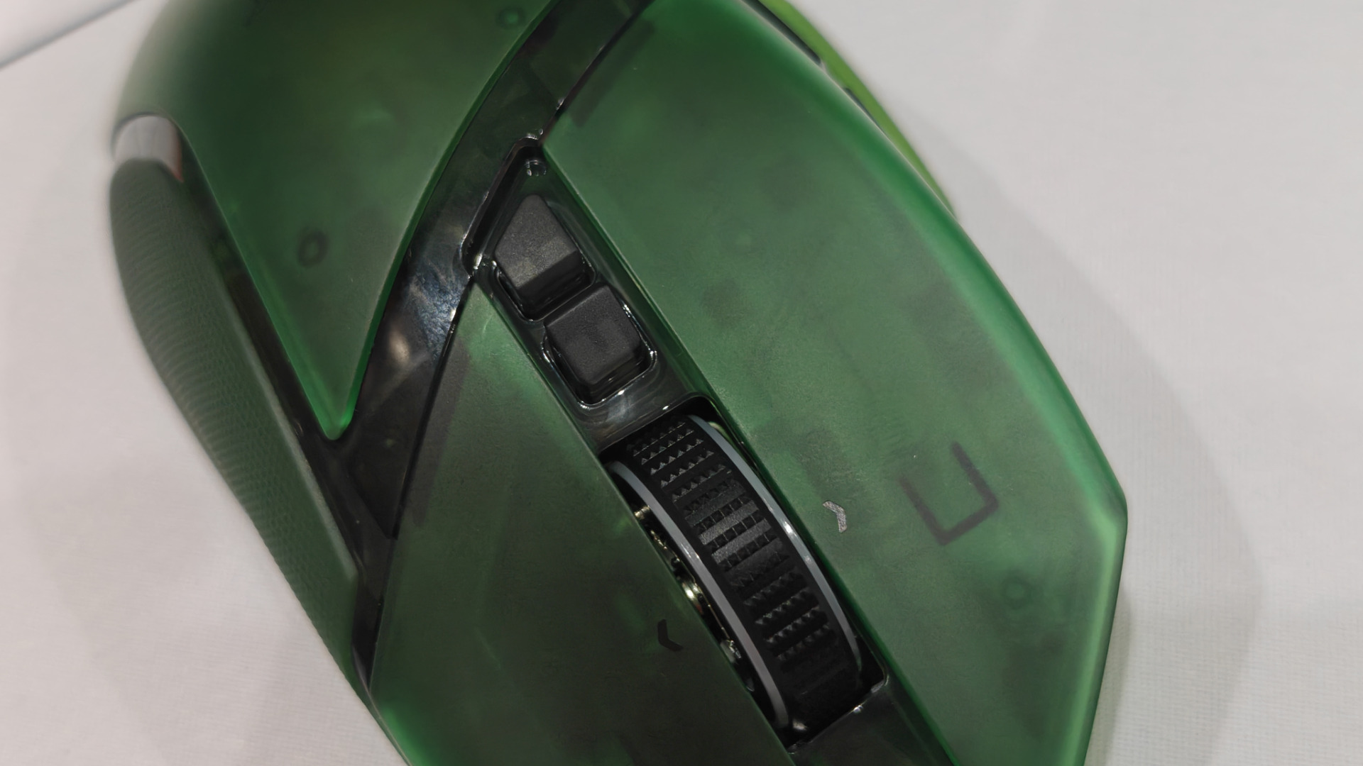 Na górze znajdziemy tradycyjne dwa przyciski główne, których funkcji raczej nie muszę tłumaczyć. Do tego dwa dodatkowe położone tuż po scrollem, pierwszy pozwala na przełączenie scrolla w tryb bez oporu (znany z myszy Logitech), który pozwoli nam szybko przescrollować długie dokumenty bez oporu kółka. Drugi natomiast to przycisk zmiany DPI. Oczywiście wszystko można będzie skonfigurować także własnoręcznie w oprogramowaniu.