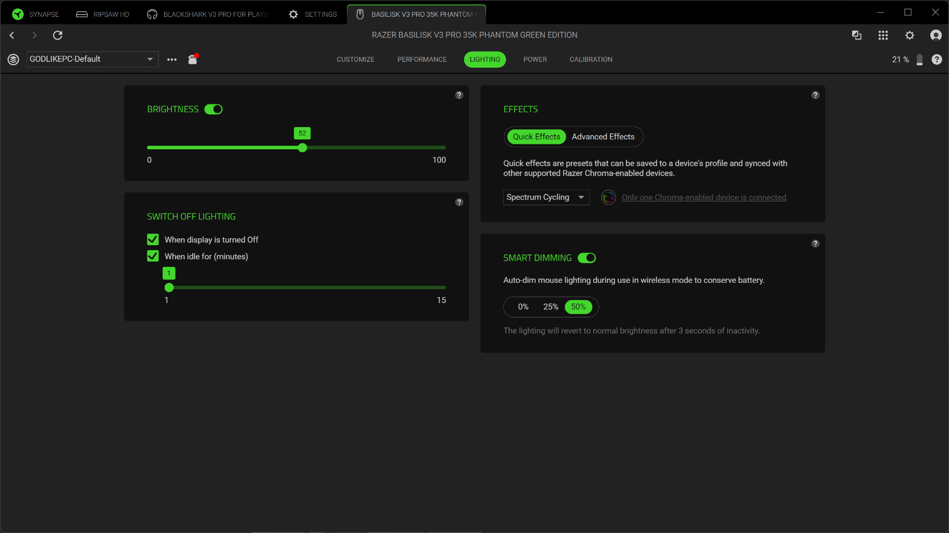 Co jeszcze śmieszniejsze, światełko sygnalizuje profil TYLKO i wyłącznie jeśli nie mamy uruchomionego oprogramowania Razer Synapse. Jeśli je mamy włączone to z jakiegoś powodu światełko ciągle świeci na biało, a powiadomienia, który mamy profil dostajemy tylko na PC w formie okienka. Bez sensu? Jeszcze jak cytując klasyka! Ja problem ten obszedłem ustawiając po prostu inne opcje podświetlenia myszki, żeby było widać od razu z góry ktory profil jest włączony i to też Wam polecam.